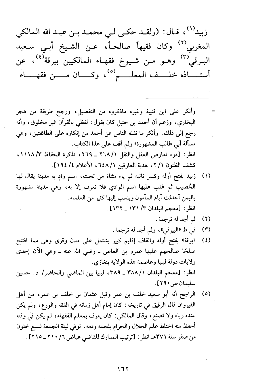 زبيد قال ولقد حكى لي محمد بن عبد الله المالكي المغربي وكان فقيهاً صالحاً عن الشيخ أبي سعيد البرقي وهو من شيوخ فقهاء المالكيين ببرقة عن أستاذه خلف المعلم وكان من فقهاء