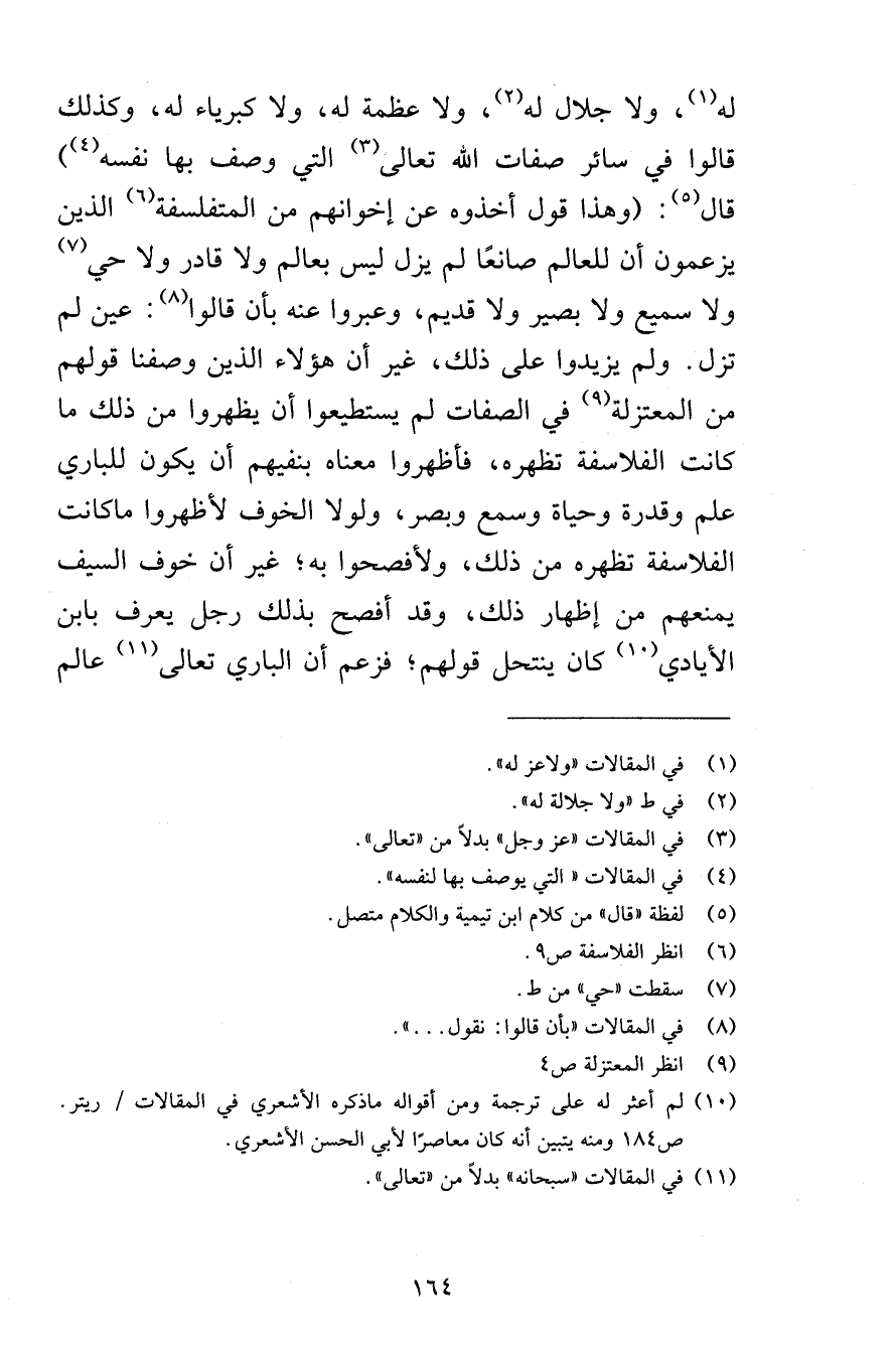له ولا جلال له ولا عظمة له ولا كبرياء له وكذلك قالوا في سائر صفات الله تعالى التي وصف بها نفسه قال وهذا قول أخذوه عن إخوانهم من المتفلسفة الذين يزعمون أن للعالم صانعًا لم يزل ليس بعالم ولا قادر ولا حي ولا سميع ولا بصير ولا قديم وعبروا عنه بأن قالوا عين لم تزل ولم يزيدوا على ذلك غير أن هؤلاء الذين وصفنا قولهم من المعتزلة في الصفات لم يستطيعوا أن يظهروا من ذلك ما كانت الفلاسفة تظهره فأظهروا معناه بنفيهم أن يكون للباري علم وقدرة وحياة وسمع وبصر ولولا الخوف لأظهروا ماكانت الفلاسفة تظهره من ذلك ولأفصحوا به غير أن خوف السيف يمنعهم من إظهار ذلك وقد أفصح بذلك رجل يعرف بابن الأيادي كان ينتحل قولهم فزعم أن الباري تعالى عالم