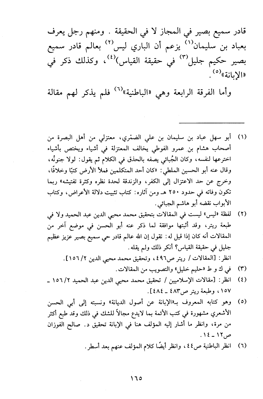 قادر سميع بصير في المجاز لا في الحقيقة ومنهم رجل يعرف بعباد بن سليمان يزعم أن الباري ليس بعالم قادر سميع بصير حكيم جليل في حقيقة القياس وكذلك ذكر في الإبانة وأما الفرقة الرابعة وهي الباطنية فلم يذكر لهم مقالة