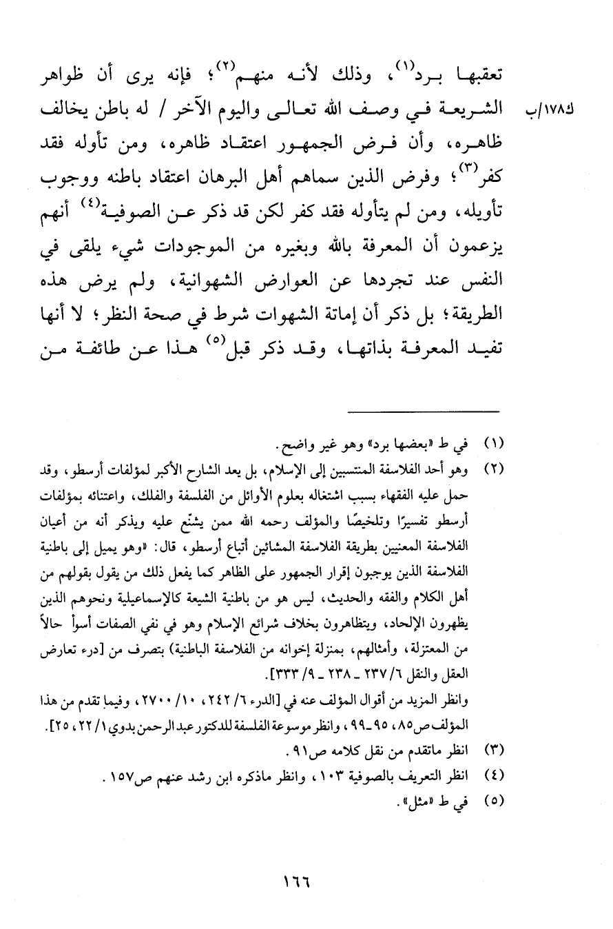 تعقبها برد وذلك لأنه منهم فإنه يرى أن ظواهر الشريعة في وصف الله تعالى واليوم الآخر له باطن يخالف ظاهره وأن فرض الجمهور اعتقاد ظاهره ومن تأوله فقد كفر وفرض الذين سماهم أهل البرهان اعتقاد باطنه ووجوب تأويله ومن لم يتأوله فقد كفر لكن قد ذكر عن الصوفية أنهم يزعمون أن المعرفة بالله وبغيره من الموجودات شيء يلقى في النفس عند تجردها من العوارض الشهوانية ولم يرض هذه الطريقة بل ذكر أن إماتة الشهوات شرط في صحة النظر لا أنها تفيد المعرفة بذاتها وقد ذكر قبل هذا عن طائفة من