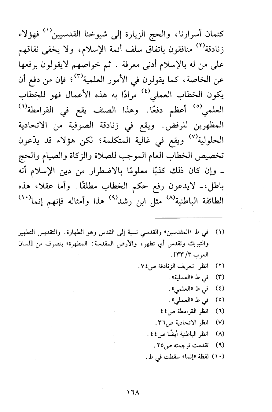 كتمان أسرارنا والحج والزيارة إلى شيوخنا القدسيين فهؤلاء زنادقة منافقون باتفاق سلف أئمة الإسلام ولا يخفى نفاقهم على من له بالإسلام أدنى معرفة ثم خواصهم لايقولون برفعها عن الخاصة كما يقولون في الأمور العلمية فإن من دفع أن يكون الخطاب العملي مرادًا به هذه الأعمال فهو للخطاب العلمي أعظم دفعًا وهذا الصنف يقع في القرامطة المظهرين للرفض ويقع في زنادقة الصوفية من الاتحادية الحلولية ويقع في غالية المتكلمة لكن هؤلاء قد يدّعون تخصيص الخطاب العام الموجب للصلاة والزكاة والصيام والحج وإن كان ذلك كذبًا معلومًا بالاضطرار من دين الإسلام أنه باطل لايدعون رفع حكم الخطاب مطلقًا وأما عقلاء هذه الطائفة الباطنية مثل ابن رشد هذا وأمثاله فإنهم إنما