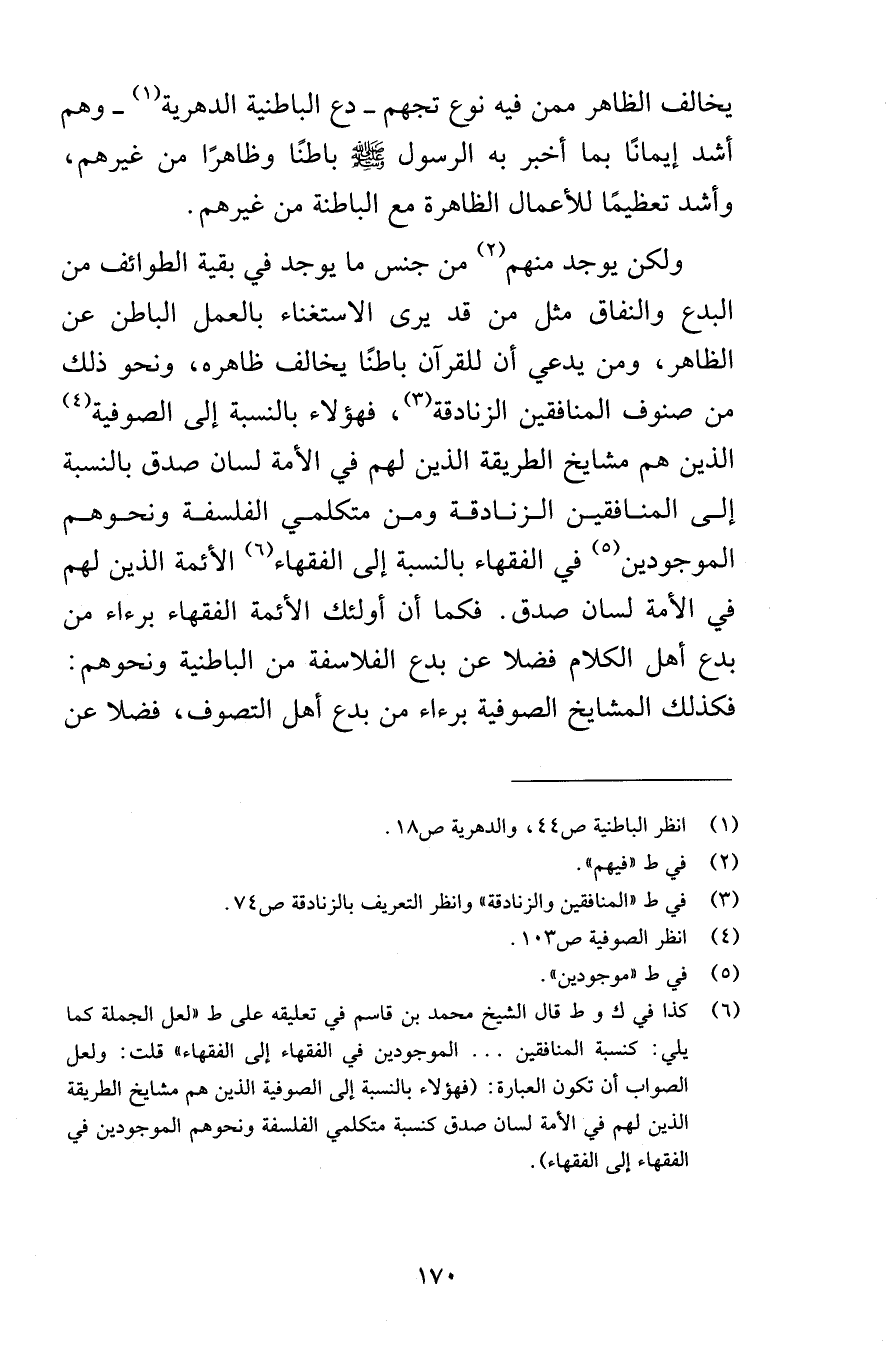 يخالف الظاهر ممن فيه نوع تجهم دع الباطنية الدهرية وهم أشد إيمانًا بما أخبر به الرسول صلى الله عليه وسلم باطنًا وظاهرًا من غيرهم وأشد تعظيمًا للأعمال الظاهرة مع الباطنة من غيرهم ولكن يوجد منهم من جنس ما يوجد في بقية الطوائف من البدع والنفاق مثل من قد يرى الاستغناء بالعمل الباطن عن الظاهر ومن يدعي أن للقرآن باطنًا يخالف ظاهره ونحو ذلك من صنوف المنافقين الزنادقة فهؤلاء بالنسبة إلى الصوفية الذين هم مشايخ الطريقة الذين لهم في الأمة لسان صدق بالنسبة إلى المنافقين الزنادقة ومن متكلمي الفلسفة ونحوهم الموجودين في الفقهاء بالنسبة إلى الفقهاء الأئمة الذين لهم في الأمة لسان صدق فكما أن أولئك الأئمة الفقهاء برءاء من بدع أهل الكلام فضلا عن بدع الفلاسفة من الباطنية ونحوهم فكذلك المشايخ الصوفية برءاء من بدع أهل التصوف فضلا عن