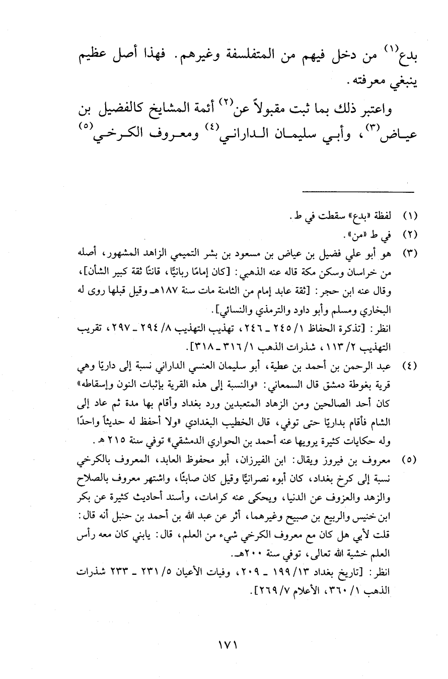 بدع من دخل فيهم من المتفلسفة وغيرهم فهذا أصل عظيم ينبغي معرفته واعتبر ذلك بما ثبت مقبولاً عن أئمة المشايخ كالفضيل بن عياض وأبي سليمان الداراني ومعروف الكرخي