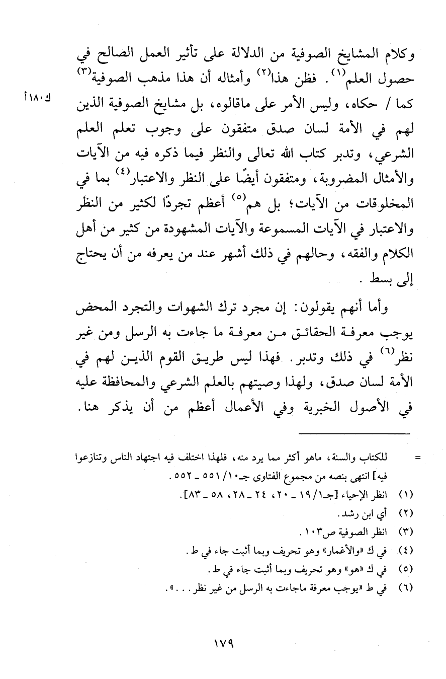 وكلام المشايخ الصوفية من الدلالة على تأثير العمل الصالح في حصول العلم فظن هذا وأمثاله أن هذا مذهب الصوفية كما حكاه وليس الأمر على ماقالوه بل مشايخ الصوفية الذين لهم في الأمة لسان صدق متفقون على وجوب تعلم العلم الشرعي وتدبر كتان الله تعالى والنظر فيما ذكره فيه من الآيات والأمثال المضروبة ومتفقون أيضًا على النظر والاعتبار بما في المخلوقات من الآيات بل هم أعظم تجردًا لكثير من النظر والاعتبار في الآيات المسموعة والآيات المشهودة من كثير من أهل الكلام والفقه وحالهم في ذلك أشهر عند من يعرفه من أن يحتاج إلى بسط وأما أنهم يقولون إن مجرد ترك الشهوات والتجرد المحض يوجب معرفة الحقائق من معرفة ما جاءت به الرسل ومن غير نظر في ذلك وتدبر فهذا ليس طريق القوم الذين لهم في الأمة لسان صدق ولهذا وصيتهم بالعلم الشرعي والمحافظة عليه في الأصول الخبرية وفي الأعمال أعظم من أن يذكر هنا