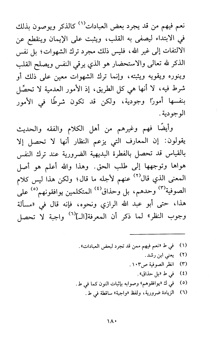 نعم فيهم من قد يجرد بعض العبادات كالذكر ويوصون بذلك في الابتداء ليصفى به القلب ويثبت على الإيمان وينقطع عن الالتفات إلى غير الله فليس ذلك مجرد ترك الشهوات بل نفس الذكر لله تعالى والاستحضار هو الذي يرقي النفس ويصلح القلب وينوره ويقويه ويثبته وإنما ترك الشهوات معين على ذلك أو شرط فيه لا أنها هي كل الطريق إذ الأمور العدمية لا تحصِّل بنفسها أمورًا وجودية ولكن قد تكون شرطًا في الأمور الوجودية وأيضًا فهم وغيرهم من أهل الكلام والفقه والحديث يقولون إن المعارف التي يزعم النظار أنها لا تحصل بالقياس قد تحصل بالفطرة البديهية الضرورية عند ترك النفس هواها وتوجهها إلى طلب الحق وهذا والله أعلم هو أصل المعنى الذي قال عنهم لأجله ما قال ولكن هذا ليس كلام الصوفية وحدهم بل وحذاق المتكلمين يوافقونهم على هذا حتى أبو عبد الله الرازي ونحوه فإنه قال في مسألة وجوب النظر لما ذكر أن المعرفة الـ واجبة لا تحصل