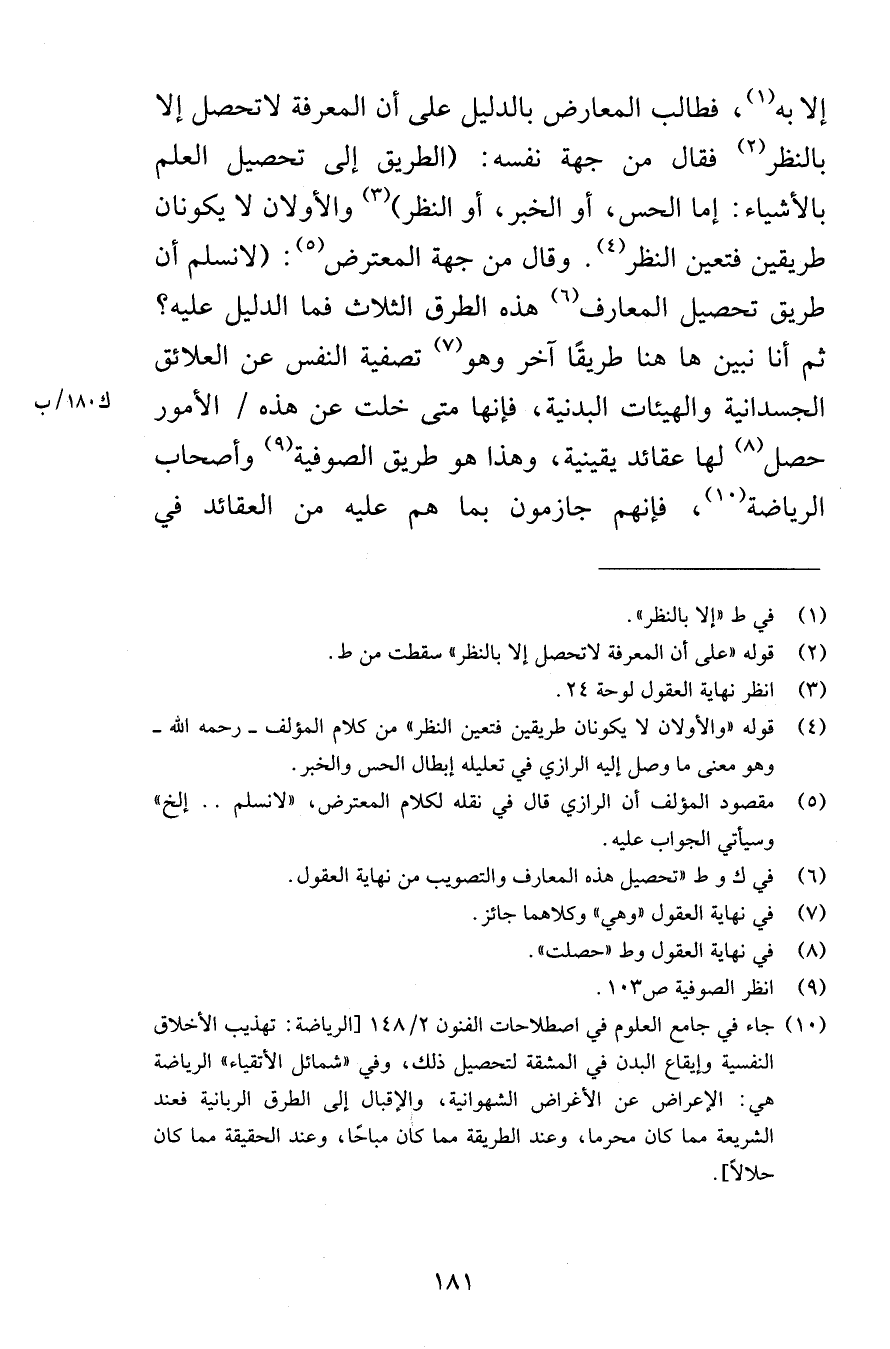 إلا به فطالب المعارض بالدليل على أن المعرفة لاتحصل إلا بالنظر فقال من جهة نفسه الطريق إلى تحصيل العلم بالأشياء إما الحس أو الخبر أو النظر والأولان لا يكونان طريقين فتعين النظر وقال من جهة المعترض لانسلم أن طريق تحصيل المعارف هذه الطرق الثلاث فما الدليل عليه ثم أنا نبين ها هنا طريقًا آخر وهو تصفية النفس عن العلائق الجسدانية والهيئات البدنية فإنها متى خلت عن هذه الأمور حصل لها عقائد يقينية وهذا هو طريق الصوفية وأصحاب الرياضة فإنهم جازمون بما هم عليه من العقائد في