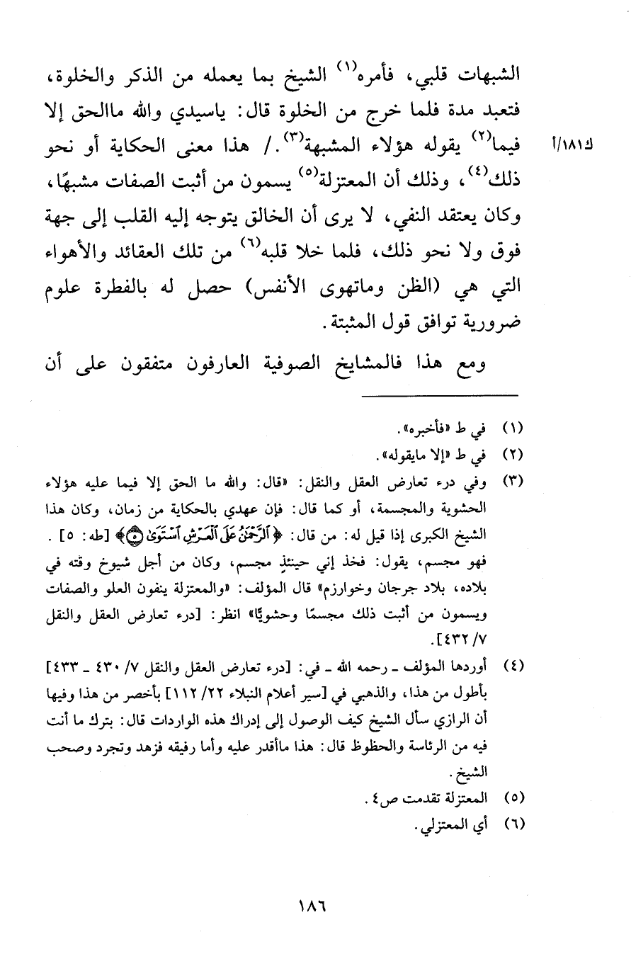 الشبهات قلبي فأمره الشيخ بما يعمله من الذكر والخلوة فتعبد مدة فلما خرج من الخلوة قال ياسيدي والله ماالحق إلا فيما يقوله هؤلاء المشبهة هذا معنى الحكاية أو نحو ذلك وذلك أن المعتزلة يسمون من أثبت الصفات مشبهًا وكان يعتقد النفي لا يرى أن الخالق يتوجه إليه القلب إلى جهة فوق ولا نحو ذلك فلما خلا قلبه من تلك العقائد والأهواء التي هي الظن وماتهوى النفس حصل له بالفطرة علوم ضرورية توافق قول المثبتة ومع هذا فالمشايخ الصوفية العارفون متفقون على أن