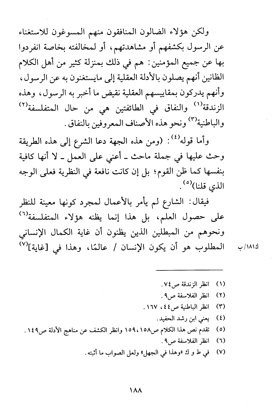 ولكن هؤلاء الضالون المنافقون منهم المسوغون للاستغناء عن الرسول بكشفهم أو مشاهدتهم أو لمخالفته بخاصة انفردوا بها عن جميع المؤمنين هم في ذلك بمنزلة كثير من أهل الكلام الظانين أنهم يصلون بالأدلة العقلية إلى مايستغنون به عن الرسول وأنهم يدركون بمقاييسهم العقلية نقيض ما أخبر به الرسول وهذه الزندقة والنفاق في الطائفتين هي في حال المتفلسفة والباطنية ونحو هذه الأصناف المعروفين بالنفاق وأما قوله ومن هذه الجهة دعا الشرع إلى هذه الطريقة وحث عليها في جملة ماحث أعني على العمل لا أنها كافية بنفسها كما ظن القوم بل إن كانت نافعة في النظرية فعلى الوجه الذي قلناه فيقال الشارع لم يأمر بالأعمال لمجرد كونها معينة للنظر على حصول العلم بل هذا إنما يظنه هؤلاء المتفلسفة ونحوهم من المبطلين الذين يظنون أن غاية الكمال الإنساني المطلوب هو أن يكون الإنسان عالمًا وهذا في غاية