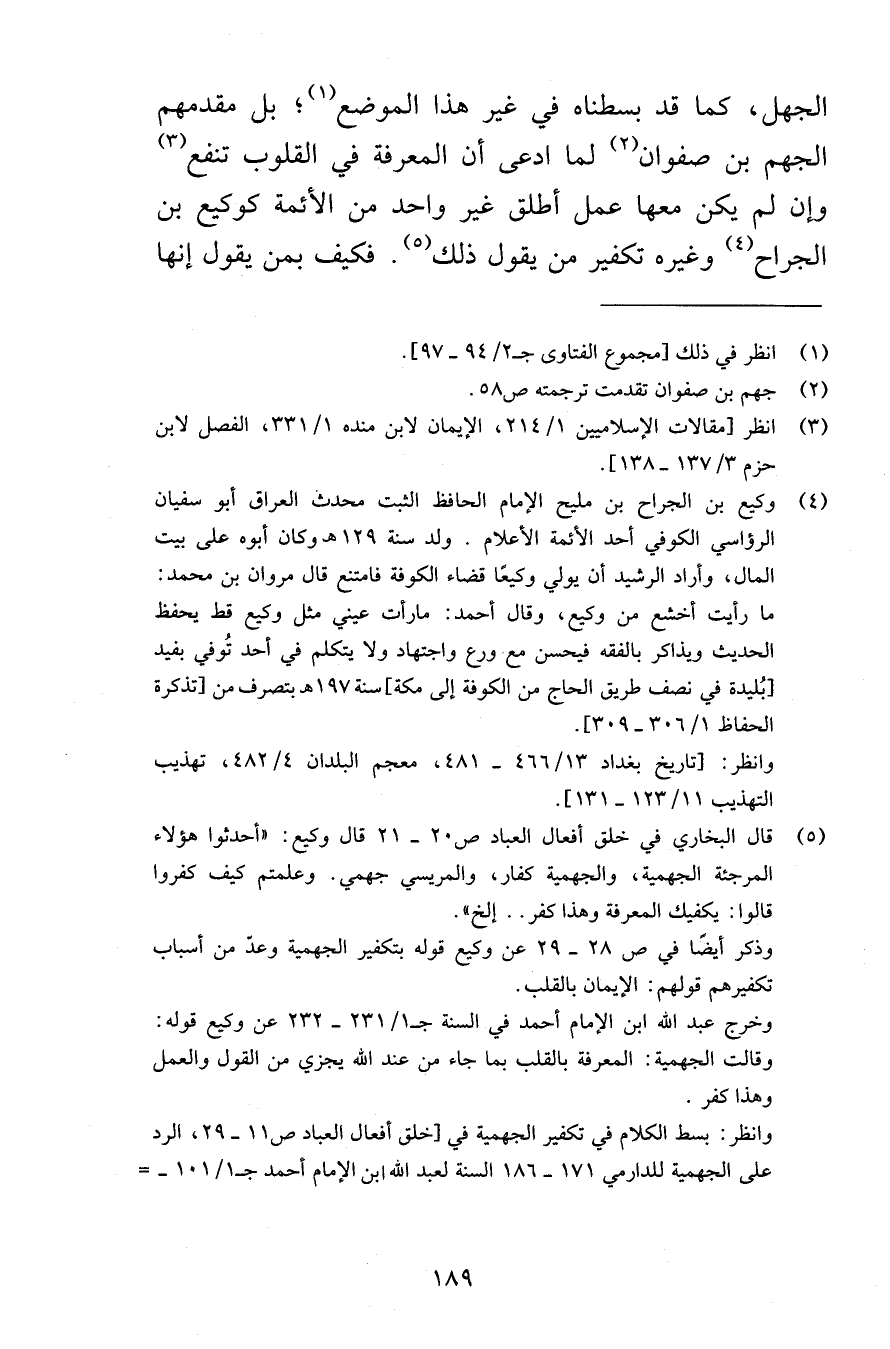 الجهل كما قد بسطنا في غير هذا الموضع بل مقدمهم الجهم بن صفوان لما ادعى أن المعرفة في القلوب تنفع وإن لم يكن معها عمل أطلق غير واحد من الأئمة كوكيع بن الجراح وغيره تكفير من يقول ذلك فكيف بمن يقول إنها
