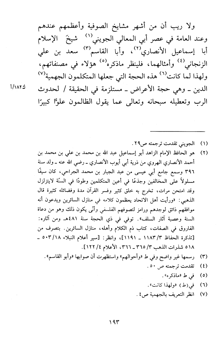 ولا ريب أن من أشهر مشايخ الصوفية وأعظمهم عندهم وعند العامة في عصر أبي المعالي الجويني شيخَ الإسلام أبا إسماعيل الأنصاري وأبا القاسم سعد بن علي الزنجاني وأمثالهما فلينظر ماذكره هؤلاء في مصنفاتهم ولهذا لما كانت هذه الحجة التي جعلها المتكلمون الجهمية الدين وهي حجة الأعراض مستلزمة في الحقيقة لحدوث الرب وتعطيله سبحانه وتعالى عما يقول الظالمون علوًّا كبيرًا