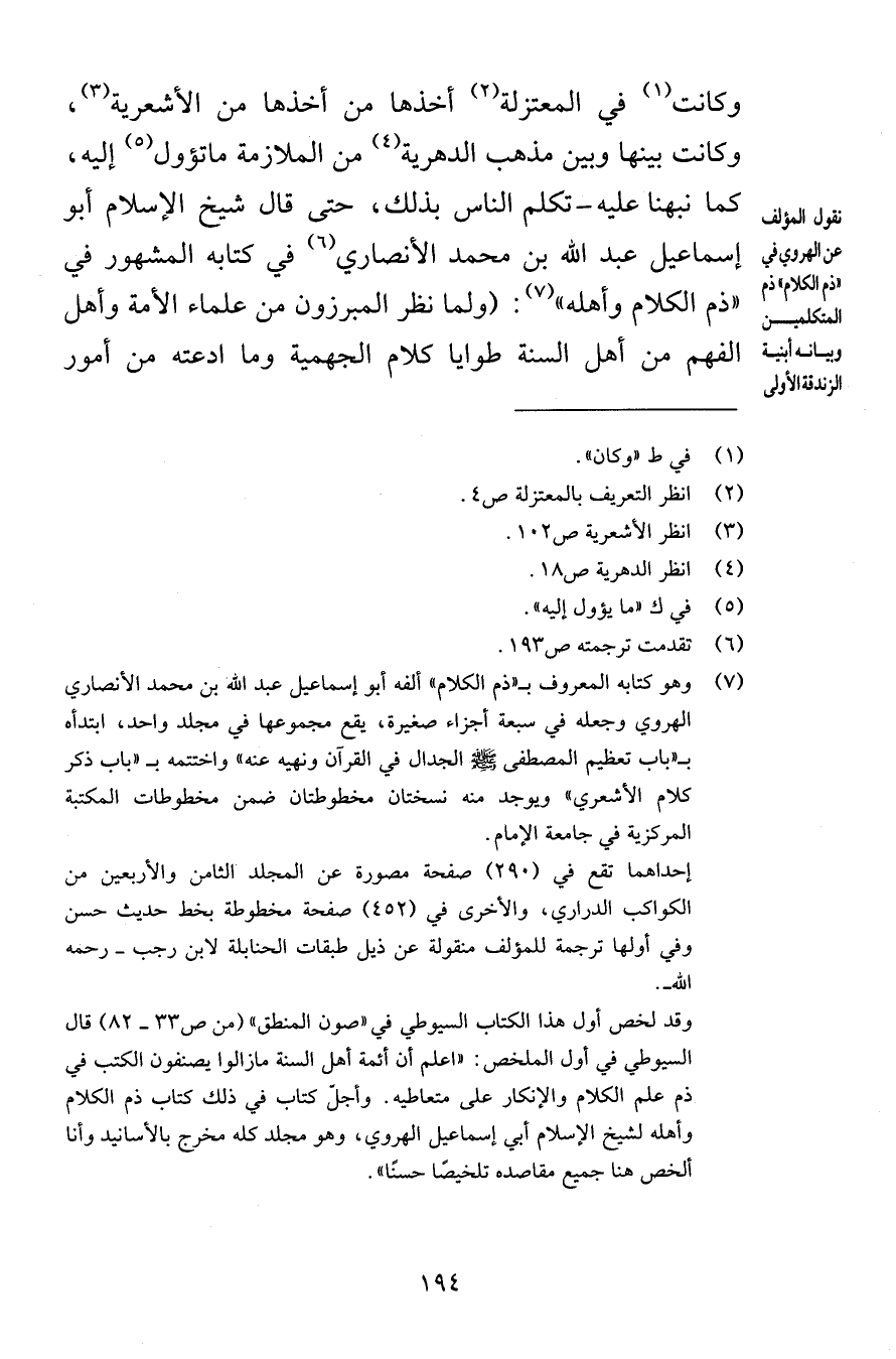 وكانت في المعتزلة أخذها من أخذها من الأشعرية وكانت بينها وبين مذهب الدهرية من الملازمة ماتؤول إليه كما نبهنا عليه تكلم الناس بذلك حتى قال شيخ الإسلام أبو إسماعيل عبد الله بن محمد الأنصاري في كتابه المشهور في ذم الكلام وأهله ولما نظر المبرزون من علماء الأمة وأهل الفهم من أهل السنة طوايا كلام الجهمية وما ادعته من أمور