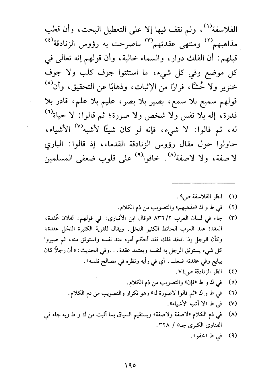 الفلاسفة ولم نقف فيها إلا على التعطيل البحت وان قطب مذاهبهم ومنتهى عقدتهم ماصرحت به رؤوس الزنادقة قبلهم أن الفلك دوار والسماء خالية وأن قولهم إنه تعالى في كل موضع وفي كل شيء ما استثنوا جوف كلب ولا جوف خنزير ولا حُشًّا فرارًا من الإثبات وذهابًا عن التحقيق وأن قولهم سميع بلا سمع بصير بلا بصر عليم بلا علم قادر بلا قدرة إله بلا نفس ولا شخص ولا صورة ثم قالوا لا حياة له ثم قالوا لا شيء فإنه لو كان شيئًا لأشبه الأشياء حاولوا حول مقال رؤوس الزنادقة القدماء إذ قالوا الباري لا صفة ولا لاصفة خافوا على قلوب ضعفى المسلمين