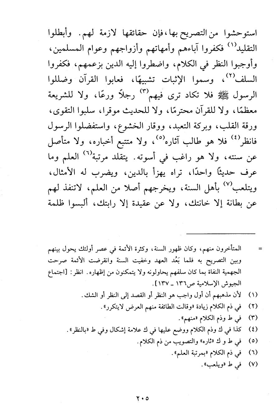 استوحشوا من التصريح بها فإن حقائقها لازمة لهم وأبطلوا التقليد فكفروا آباءهم وأمهاتهم وأزواجهم وعوام المسلمين وأوجبوا النظر في الكلام واضطروا إليه الدين بزعمهم فكفروا السلف وسموا الإثبات تشبيهًا فعابوا القرآن وضللوا الرسول صلى الله عليه وسلم فلا تكاد ترى فيهم رجلاً ورعًا ولا للشريعة معظمًا ولا للقرآن محترمًا ولا للحديث موقرا سلبوا التقوى ورقة القلب وبركة التعبد ووقار الخشوع واستفضلوا الرسول فانظر فلا هو طالب آثاره ولا متتبع أخباره ولا متأصل عن سنته ولا هو راغب في أسوته يتقلد مرتبة العلم وما عرف حديثًا واحدًا تراه يهزأ بالدين ويضرب له الأمثال ويتلعب بأهل السنة ويخرجهم أصلا من العلم لاتنفذ لهم عن بطانة إلا خانتك ولا عن عقيدة إلا رابتك ألبسوا ظلمة