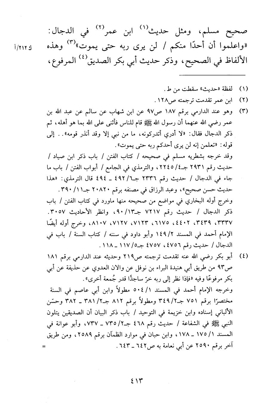 صحيح مسلم وحديث ابن عمر في الدجال واعلموا أن أحدًا منكم لن يرى ربه حتى يموت وهذه الألفاظ في الصحيح وذكر حديث أبي بكر الصديق المرفوع