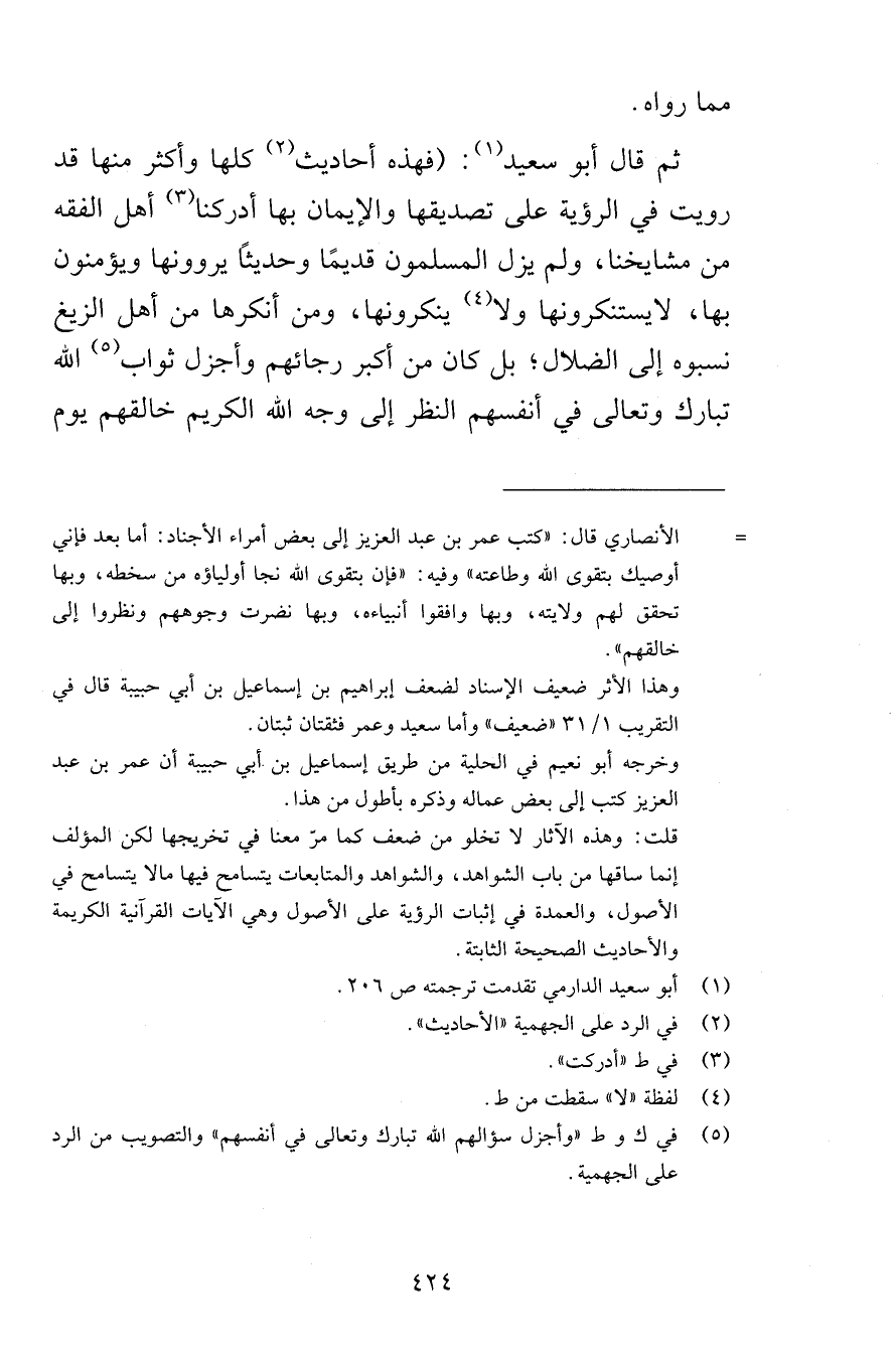 مما رواه ثم قال أبو سعيد فهذه أحاديث كلها وأكثر منها قد رويت في الرؤية على تصديقها والإيمان بها أدركنا أهل الفقه من مشايخنا ولم يزل المسلمون قديمًا وحديثًا يروونها ويؤمنون بها لايستنكرونها ولا ينكرونها ومن أنكرها من أهل الزيغ نسبوه إلى الضلال بل كان من أكبر رجائهم وأجزل ثواب الله تبارك وتعالى في أنفسهم النظر إلى وجه الله الكريم خالقهم يوم