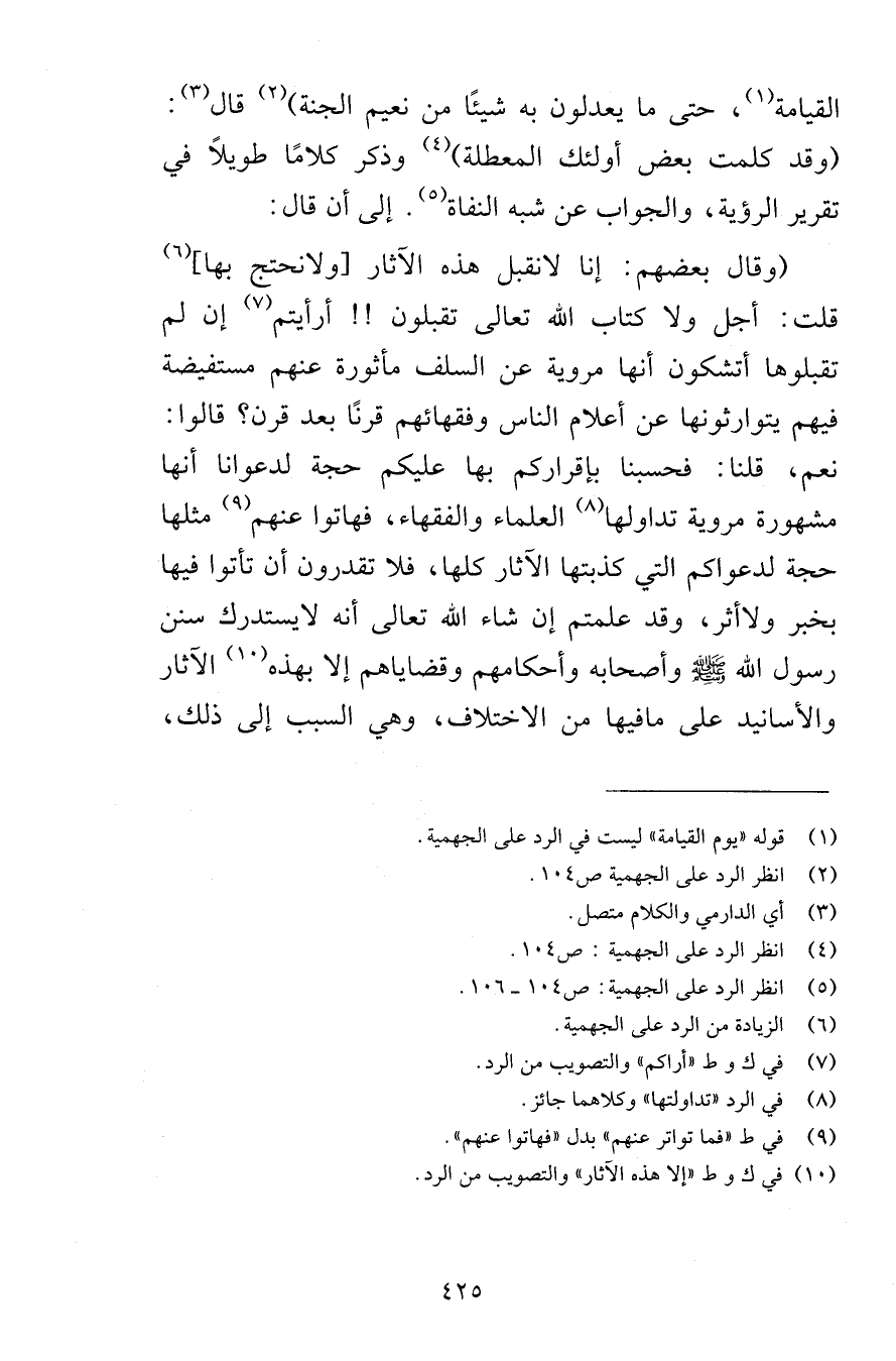 القيامة حتى ما يعدلون به شيئًا من نعيم الجنة قال وقد كلمت بعض أولئك المعطلة وذكر كلامًا طويلاً في تقرير الرؤية والجواب عن شبه النفاة إلى أن قال وقال بعضهم إنا لانقبل هذه الآثار ولانحتج بها قلت أجل ولا كتاب الله تعالى تقبلون أرأيتم إن لم تقبلوها أتشكون أنها مروية عن السلف مأثورة عنهم مستفيضة فيهم يتوارثونها عن أعلام الناس وفقهائهم قرنًا بعد قرن قالوا نعم قلنا فحسبنا بإقراركم بها عليكم حجة لدعوانا أنها مشهورة مروية تداولها العلماء والفقهاء فهاتوا عنهم مثلها حجة لدعواكم التي كذبتها الآثار كلها فلا تقدرون أن تأتوا فيها بخبر ولاأثر وقد علمتم إن شاء الله تعالى أنه لايستدرك سنن رسول الله صلى الله عليه وسلم وأصحابه وأحكامهم وقضاياهم إلا بهذه الآثار والأسانيد على مافيها من الاختلاف وهي السبب إلى ذلك