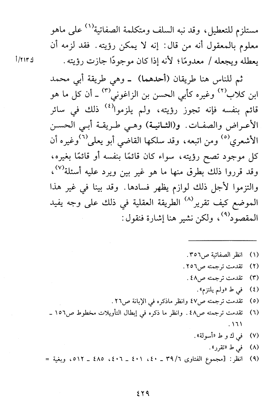 مستلزم للتعطيل وقد نبه السلف ومتكلمة الصفاتية على ماهو معلوم بالمعقول أنه من قال غنه لا يمكن رؤيته فقد لزم أن يعطله ويجعله معدومًا لأنه إذا كان موجودًا جازت رؤيته ثم للناس هنا طريقان أحدهما وهي طريقة أبي محمد ابن كلاب وغيره كأبي الحسن بن الزاغوني أن كل ما هو قائم بنفسه فإنه تجوز رؤيته ولم يلزموا ذلك في سائر الأعراض والصفات والثانية وهي طريقة أبي الحسن الشعري ومن اتبعه وقد سلكها القاضي أبو يعلى وغيره أن كل موجود تصح رؤيته سواء كان قائمًا بنفسه أو قائمًا بغيره وقد قرروا ذلك بطرق منها ما هو غير بين ويرد عليه أسئلة والتزموا لأجل ذلك لوازم يظهر فسادها وقد بينا في غير هذا الموضع كيف تقرير الطريقة العقلية في ذلك على وجه يفيد المقصود ولكن نشير هنا إشارة فنقول