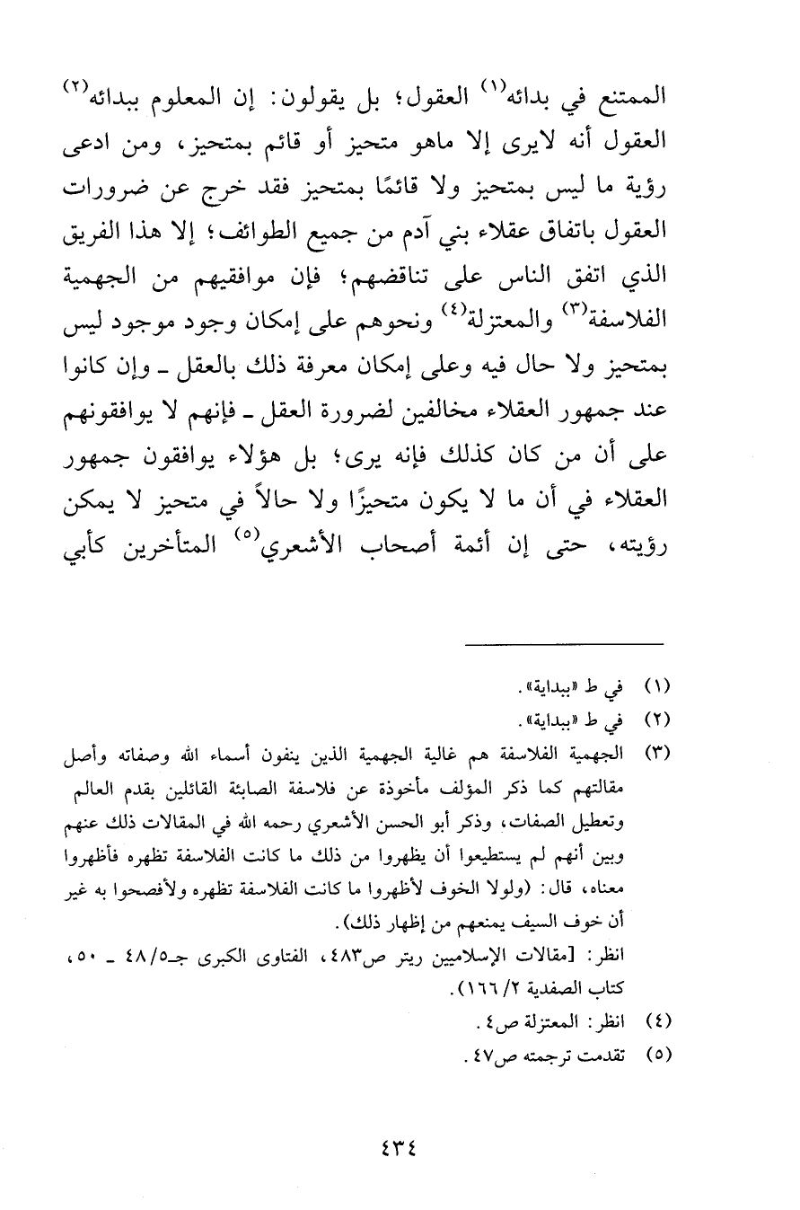 الممتنع في بدائه العقول بل يقولون إن المعلوم ببدائه العقول أنه لايرى إلا ماهو متحيز أو قائم بمتحيز ومن ادعى رؤية ما ليس بمتحيز ولا قائمًا بمتحيز فقد خرج عن ضرورات العقول باتفاق عقلاء بني آدم من جميع الطوائف إلا هذا الفريق الذي اتفق الناس على تناقضهم فإن موافقيهم من الجهمية الفلاسفة والمعتزلة ونحوهم على إمكان وجود موجود ليس بمتحيز ولا حال فيه وعلى إمكان معرفة ذلك بالعقل وإن كانوا عند جمهور العقلاء مخالفين لضرورة العقل فإنهم لا يوافقونهم على أن من كان كذلك فإنه يرى بل هؤلاء يوافقون جمهور العقلاء في أن ما لا يكون متحيزًا ولا حالاً في متحيز لا يمكن رؤيته حتى إن أئمة أصحاب الأشعري المتأخرين كأبي