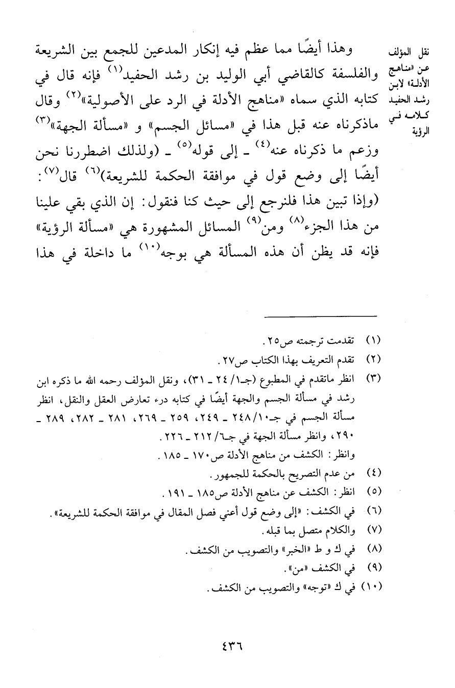 وهذا أيضًا مما عظم فيه إنكار المدعين للجمع بين الشريعة والفلسفة كالقاضي أبي الوليد بن رشد الحفيد فإنه قال في كتابه الذي سماه مناهج الأدلة في الرد على الأصولية وقال ما ذكرناه عنه إلى قوله ولذلك اضطررنا نحن أيضًا إلى وضع قول في موافقة الحكم للشريعة قال وإذا تبين هذا فلنرجع إلى حيث كنا فنقول إن الذي بقى علينا من هذا الجزء ومن المسائل المشهورة هي مسألة الرؤية فإنه قد يظن أن هذه المسألة هي بوجه ما داخلة في هذا