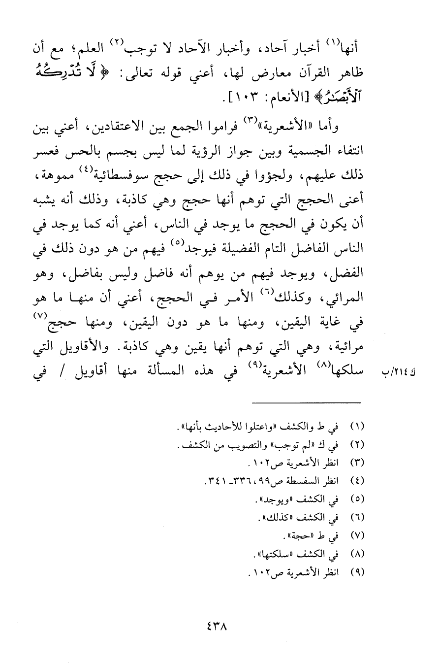 أنها أخبار آحاد وأخبار الآحاد لا توجب العلم مع أن ظاهر القرآن معارض لها أعني قوله تعالى لاَّ تُدْرِكُهُ الأَبْصَارُ [الأنعام 103] وأما الأشعرية فراموا الجمع بين الاعتقادين أعني بين انتفاء الجسمية وبين جواز الرؤية لما ليس بجسم بالحس فعسر ذلك عليهم ولجؤوا في ذلك إلى حجج سوفسطائية مموهة أعني الحجج التي توهم أنها حجج وهي كاذبة وذلك أنه يشبه أن يكون في الحجج ما يوجد في الناس أعني أنه كما يوجد في الناس الفاضل التام الفضيلة فيوجد فيهم من هو دون ذلك في الفضل ويوجد فيهم من يوهم أنه فاضل وليس بفاضل وهو المرائي وكذلك الأمر في الحجج أعني أن منها ما هو في غاية اليقين ومنها ما هو دون اليقين ومنها حجج مرائية وهي التي توهم أنها يقين وهي كاذبة والأقاويل التي سلكها الأشعرية في هذه المسألة منها أقاويل في