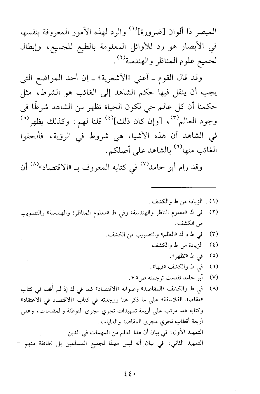 المبصر ذا ألوان ضرورة والرد لهذه الأمور المعروفة بنفسها في الأبصار هو رد للأوائل المعلومة بالطبع للجميع وإبطال لجميع علوم المناظر والهندسة وقد قال القوم أعني الأشعرية إن أحد المواضع التي يجب أن ينقل فيها حكم الشاهد إلى الغائب هو الشرط مثل حكمنا أن كل عالم حي لكون الحياة تظهر من الشاهد شرطًا في وجود العالم وإن كلن كذلك قلنا لهم وكذلك يظهر في الشاهد أن هذه الأشياء هي شروط في الرؤية فألحقوا الغائب منها بالشاهد على أصلكم وقد رام أبو حامد في كتابه المعروف بـ الاقتصاد أن