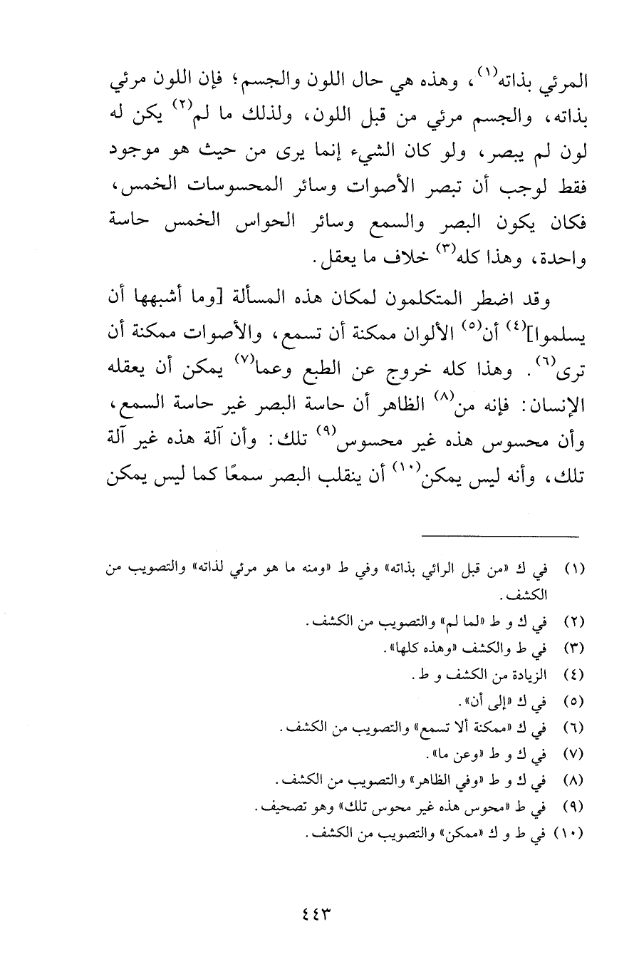المرئي بذاته وهذه هي حال اللون والجسم فإن اللون مرئي بذاته والجسم مرئي من قبل اللون ولذاك ما لم يكن له لون لم يبصر ولو كان الشيء إنما يرى من حيث هو موجود فقط لوجب أن تبصر الأصوات وسائر المحسوسات الخمس فكان يكون البصر والسمع وسائر الحواس الخمس حاسة واحدة وهذا كله خلاف ما يعقل وقد اضطر المتكلمون لمكان هذه المسألة وما أشبهها أن يسلموا أن الألوان ممكنة أن تسمع والأصوات ممكنة أن ترى وهذا كله خروج عن الطبع وعما يمكن أن يعقله الإنسان فإنه من الظاهر أن حاسة البصر غير حاسة السمع وأن محسوس هذه غير محسوس تلك وأن آلة هذه غير آلة تلك وأنه ليس يمكن أن ينقلب البصر سمعًا كما ليس يمكن