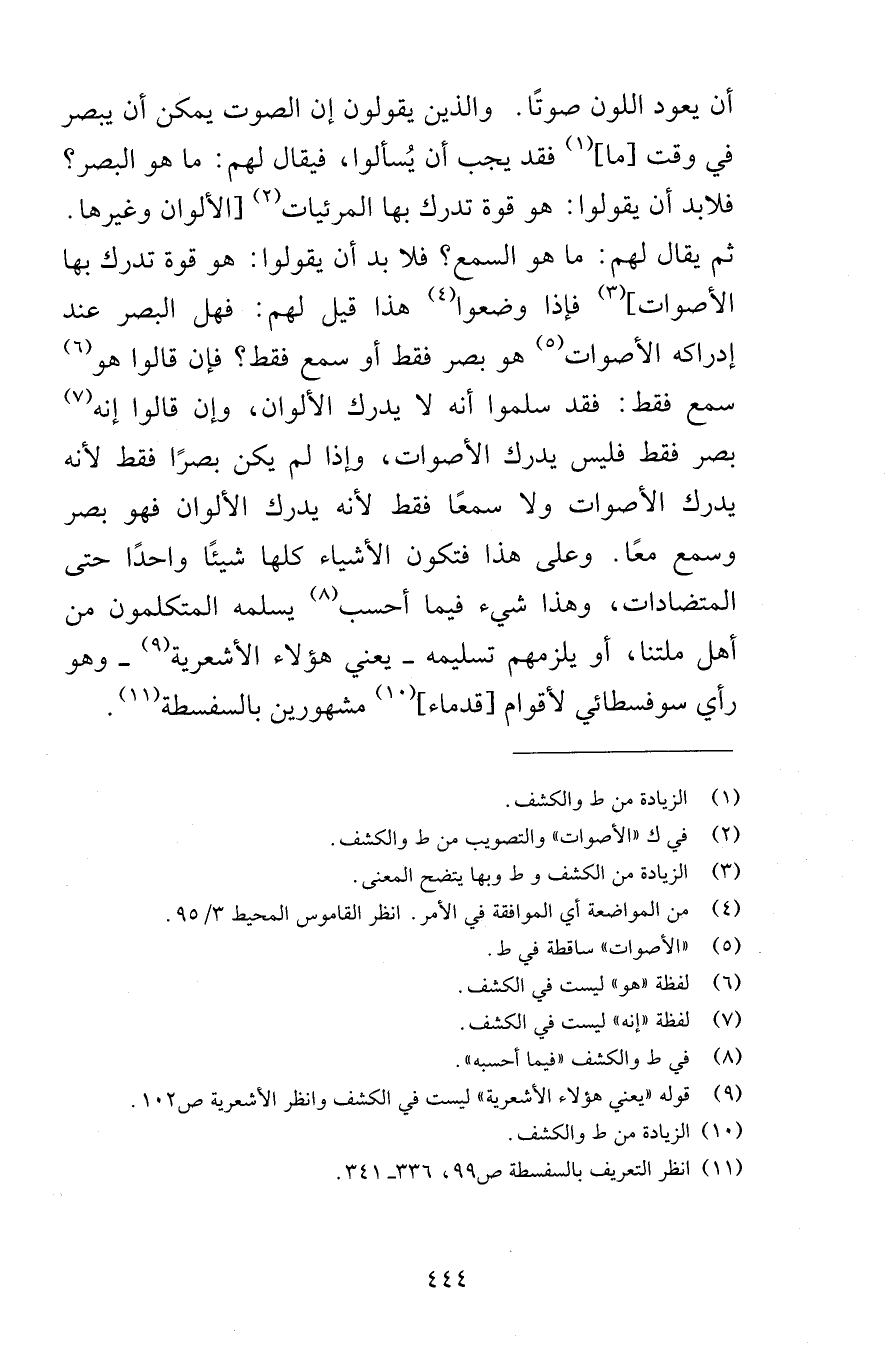 أن يعود اللون صوتًا والذين يقولون إن الصوت يمكن أن يبصر في وقت ما فقد يجب أن يُسألوا فيقال لهم ما هو البصر فلابد أن يقولوا هو قوة تدرك بها المرئيات الألوان وغيرها ثم يقال لهم ما هو السمع فلا بد أن يقولوا هو قوة تدرك بها الأصوات فإذا وضعوا هذا قيل لهم فهل البصر عند إدراكه الأصوات هو بصر فقط أو سمع فقط فإن قالوا هو سمع فقط فقد سلموا أنه لا يدرك الألوان وإن قالوا أنه بصر فقط فليس يدرك الأصوات وإذا لم يكن بصرًا فقط لأنه يدرك الأصوات ولا سمعًا فقط لأنه يدرك الألوان فهو بصر وسمع معًا وعلى هذا فتكون الأشياء كلها شيئًا واحدًا حتى المتضادات وهذا شيء فيما أحسب يسلمه المتكلمون من أهل ملتنا أو يلزمهم تسليمه يعني هؤلاء الأشعرية وهو رأي سوفسطائي لأقوام قدماء مشهورين بالسفسطة