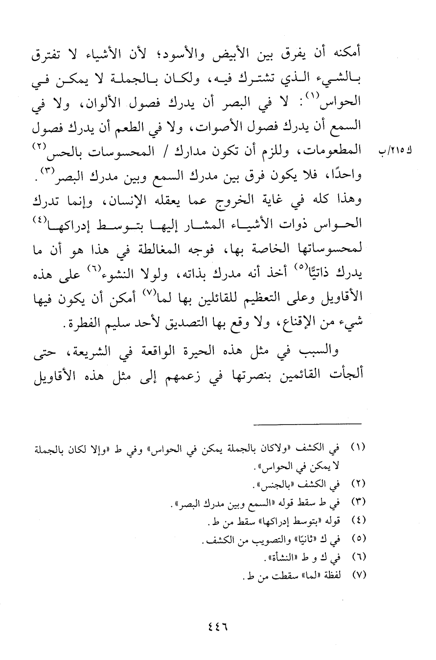 أمكنه أن يفرق بين الأبيض والأسود لأن الأشياء لا تفترق بالشيء الذي تشترك فيه ولكان بالجملة لا يمكن في الحواس لا في البصر أن يدرك فصول الألوان ولا في السمع أن يدرك فصول الأصوات ولا في الطعم أن يدرك فصول المطعومات وللزم أن تكون مدارك المحسوسات بالحس واحدًا فلا يكون فرق بين مدرك السمع وبين مدرك البصر وهذا كله في غاية الخروج عما يعقله الإنسان وإنما تدرك الحواس ذوات الأشياء المشار إليها بتوسط إدراكها لمحسوساتها الخاصة بها فوجه المغالطة في هذا هو أن ما يدرك ذاتيًّا أخذ أنه مدرك بذاته ولولا النشوء على هذه الأقاويل وعلى التعظيم للقائلين بها لما أمكن أن يكون فيها شيء من الإقناع ولا وقع بها التصديق لأحد سليم الفطرة والسبب في مثل هذه الحيرة الواقعة في الشريعة حتى ألجأت القائمين بنصرتها في زعمهم إلى مثل هذه الأقاويل