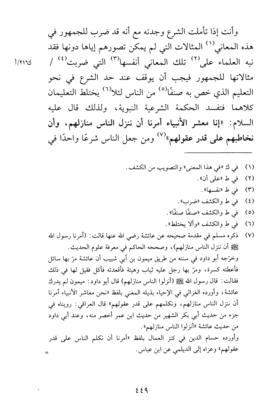 وأنت إذا تأملت الشرع وجدته مع أنه قد ضرب للجمهور في هذه المعاني المثالات التي لم يمكن تصورهم إياها دونها فقد نبه العلماء على تلك المعاني أنفسها التي ضربت مثالاتها للجمهور فيجب أن يوقف عند حد الشرع في نحو التعليم الذي خص به صنفًا من الناس لئلا يختلط التعليمان كلاهما فتفسد الحكمة الشرعية النبوية ولذلك قال عليه السلام إنا معشر الأنبياء أمرنا أن ننزل الناس منازلهم وأن نخاطبهم على قدر عقولهم ومن جعل الناس شرعًا واحدًا في