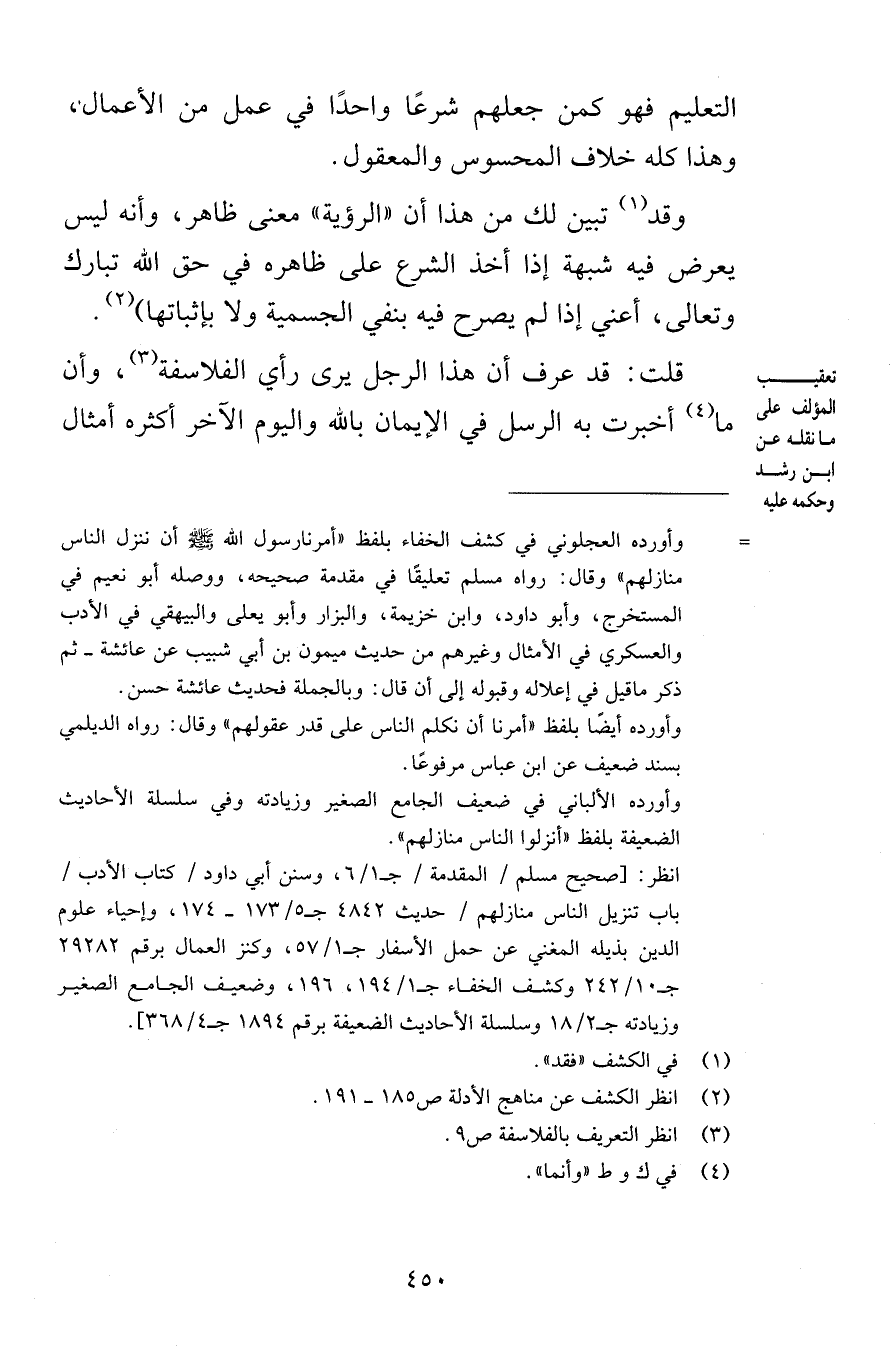 التعليم فهو كمن جعلهم شرعًا واحدًا في عمل من الأعمال وهذا كله خلاف المحسوس والمعقول وقد تبين لك من هذا أن الرؤية معنى ظاهر وأنه ليس يعرض فيه شبهة إذا أخذ الشرع على ظاهره في حق الله تبارك وتعالى أعني إذا لم يصرح فيه بنفي الجسمية ولا بإثباتها قلت قد عرف أن هذا الرجل يرى رأي الفلاسفة وأن ما أخبرت به الرسل في الإيمان بالله واليوم الآخر أكثره أمثال