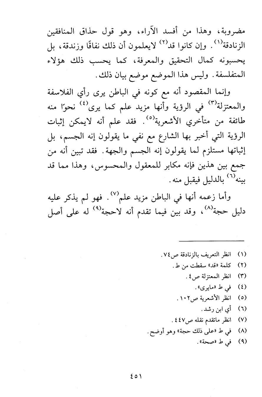 مضروبة وهذا من أفسد الآراء وهو قول حذاق المنافقين الزنادقة وإن كانوا قد لايعلمون أن ذلك نفاقًا وزندقة بل يحسبونه كمال التحقيق والمعرفة كما يحسب ذلك هؤلاء المتفلسفة وليس هذا الموضع موضع بيان لذلك وإنما المقصود أنه مع كونه في الباطن يرى رأي الفلاسفة والمعتزلة في الرؤية وأنها مزيد علم كما يرى نحوًا منه طائفة من متأخري الأشعرية فقد علم انه لايمكن إثبات الرؤية التي أخبر بها الشارع مع نفي ما يقولونه إنه الجسم بل إثباتها مستلزم لما يقولون إنه الجسم والجهة فقد تبين أنه من جمع بين هذين فإنه مكابر للمعقول والمحسوس وهذا مما قد بينه بالدليل فيقبل منه وأما زعمه أنها في الباطن مزيد علم فهو لم يذكر عليه دليل حجة وقد بين فيما تقدم أنه لاحجة له على أصل