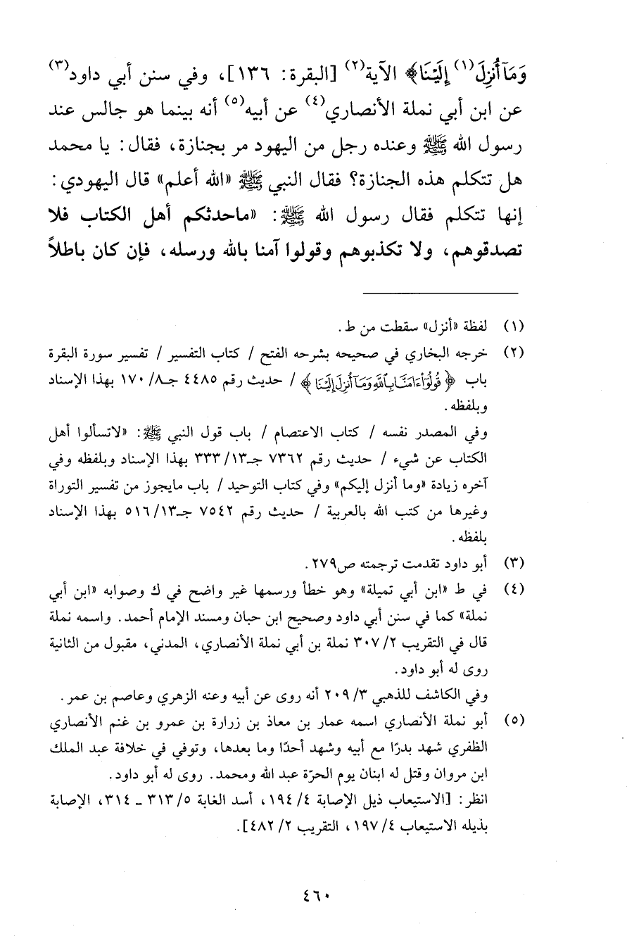 وَمَا أُنزِلَ إِلَيْنَا الآية [البقرة 136] وفي سنن أبي داود عن ابن أبي نملة الأنصاري عن أبيه أنه بينما هو جالس عند رسول الله صلى الله عليه وسلم وعنده رجل من اليهود مر بجنازة فقال يا محمد هل تتكلم هذه الجنازة فقال النبي صلى الله عليه وسلم الله أعلم قال اليهودي إنها تتكلم فقال رسول الله صلى الله عليه وسلم ماحدثكم أهل الكتاب فلا تصدقوهم ولا تكذبوهم وقولوا آمنا بالله ورسله فإن كان باطلاً