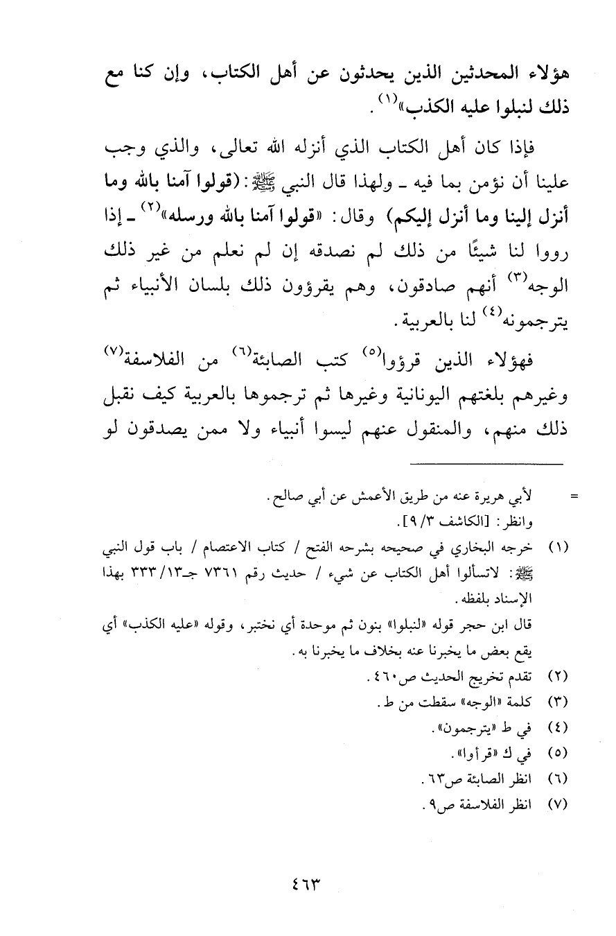 هؤلاء المحدثين الذين يحدثون عن أهل الكتاب وإن كنا مع ذلك لنبلوا عليه الكذب فإذا كان أهل الكتاب الذي أنزله الله تعالى والذي وجب علينا أن نؤمن بما فيه ولهذا قال النبي صلى الله عليه وسلم قولوا آمنا بالله وما أنزل إلينا وما أنزل إليكم وقال قولوا آمنا بالله ورسله إذا رووا لنا شيئًا من ذلك لم نصدقه إن لم نعلم من غير ذلك الوجه أنهم صادقون وهم يقرؤون ذلك بلسان الأنبياء ثم يترجمونه لنا بالعربية فهؤلاء الذين قرؤوا كتب الصابئة من الفلاسفة وغيرهم بلغتهم اليونانية وغيرها ثم ترجموها بالعربية كيف نقبل ذلك منهم والمنقول عنهم ليسوا أنبياء ولا ممن يصدقون لو