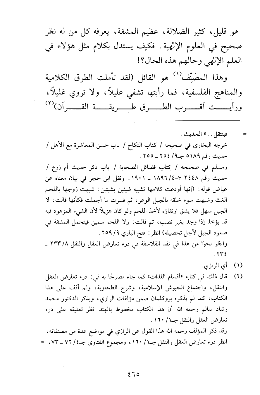 هو قليل كثير الضلالة عظيم المشقة يعرفه كل من له نظر صحيح في العلوم الإلهية فكيف يستدل بكلام مثل هؤلاء في العلم الإلهي وحالهم هذه الحال وهذا المصَنّّف هو القائل لقد تأملت الطرق الكلامية والمناهج الفلسفية فما رأيتها تشفي عليلاً ولا تروي غليلاً ورأيت أقرب الطرق طريقة القرآن