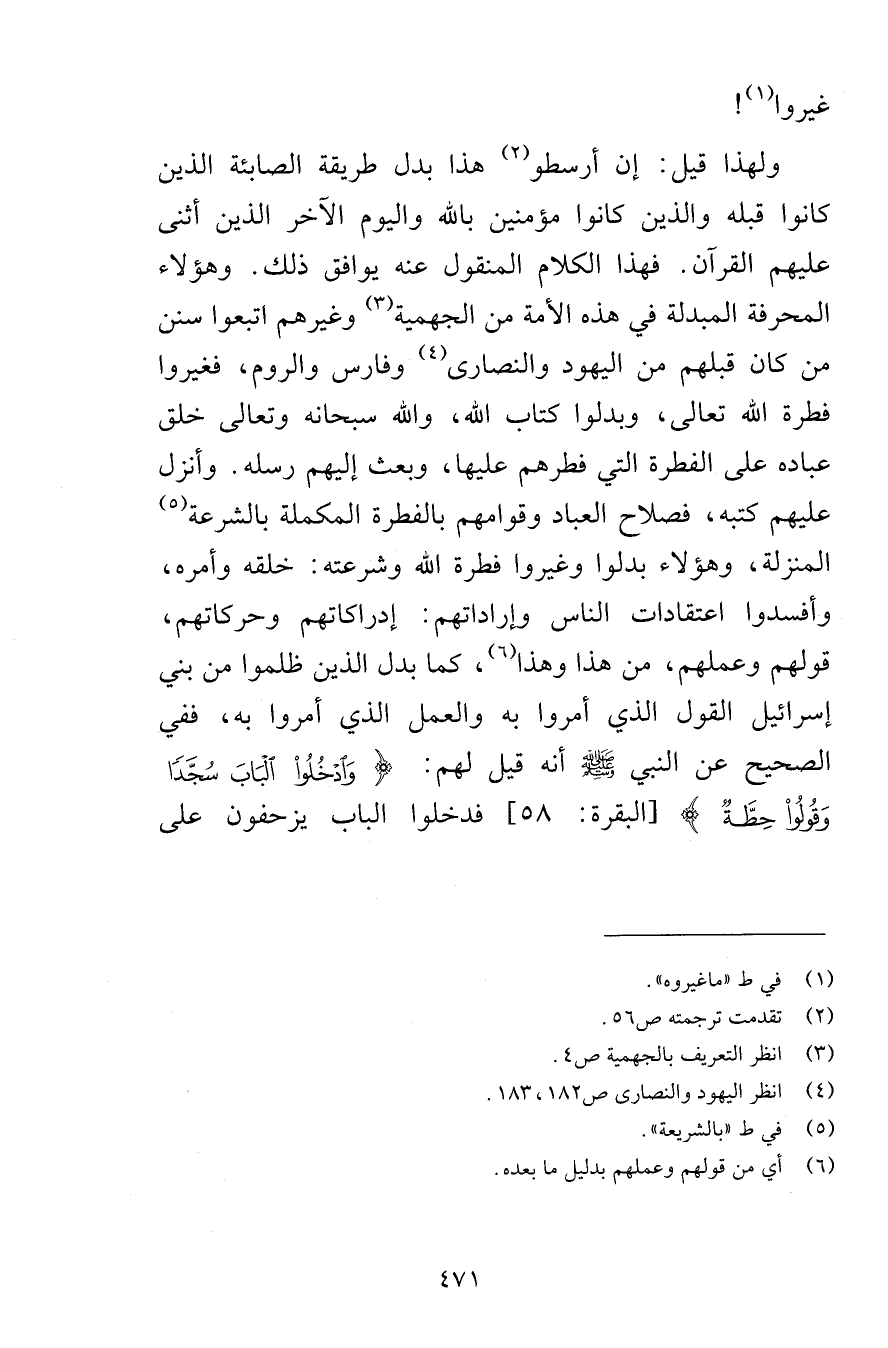 غيروا ولهذا قيل إن أرسطو هذا بدل طريقة الصابئة الذين كانوا قبله والذين كانوا مؤمنين بالله واليوم الآخر الذين أثنى عليهم القرآن فهذا الكلام المنقول عنه يوافق ذلك وهؤلاء المحرفة المبدلة في هذه الأمة من الجهمية وغيرهم اتبعوا سنن من كان قبلهم من اليهود والنصارى وفارس والروم فغيروا فطرة الله تعالى وبدلوا كتاب الله والله سبحانه وتعالى خلق عباده على الفطرة التي فطرهم عليها وبعث إليهم رسله وأنزل عليهم كتبه فصلاح العباد وقوامهم بالفطرة المكملة بالشرعة المنزلة وهؤلاء بدلوا وغيروا فطرة الله وشرعته خلقه وأمره وأفسدوا اعتقادات الناس وإراداتهم إدراكاتهم وحركاتهم قولهم وعملهم من هذا وهذا كما بدل الذين ظلموا من بني إسرائيل القول الذي أمروا به والعمل الذي أمروا به ففي الصحيح عن النبي صلى الله عليه وسلم أنه قيل لهم وَادْخُلُواْ الْبَابَ سُجَّداً وَقُولُواْ حِطَّةٌ [البقرة 58] فدخلوا الباب يزحفون على