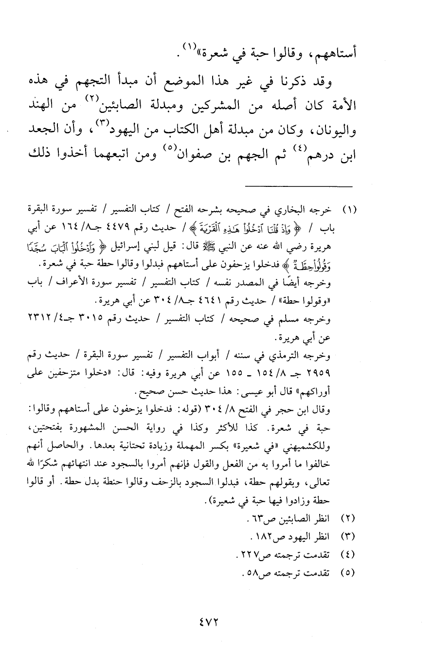 أستاهم وقالوا حبة في شعرة وقد ذكرنا في غير هذا الموضع أن مبدأ التجهم في هذه الأمة كان أصله من المشركين ومبدلة الصابئين من الهند واليونان وكان من مبدلة أهل الكتاب من اليهود وأن الجعد ابن درهم ثم الجهم بن صفوان ومن اتبعهما أخذوا ذلك