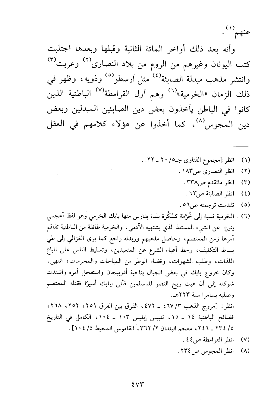 عنهم وأنه بعد ذلك أواخر المائة الثانية وقبيلها وبعدها اجتلبت كتب اليونان وغيرهم من الروم من بلاد النصارى وعربت وانتشر مذهب مبدلة الصابئة مثل أرسطو وذويه وظهر في ذلك الزمان الخرمية وهم أول القرامطة الباطنية الذين كانوا في الباطن يأخذون بعض دين الصابئين المبدلين وبعض دين المجوس كما أخذوا عن هؤلاء كلامهم في العقل