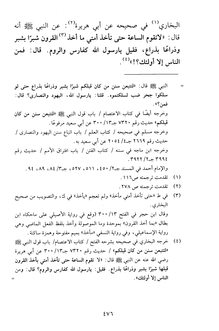 البخاري في صحيحه عن أبي هريرة عن النبي صلى الله عليه وسلم أنه قال لاتقوم الساعة حتى تأخذ أمتي ما أخذ القرون شبرًا بشبر وذراعًا بذراع فقيل يارسول الله كفارس والروم قال فمن الناس إلا أولئك