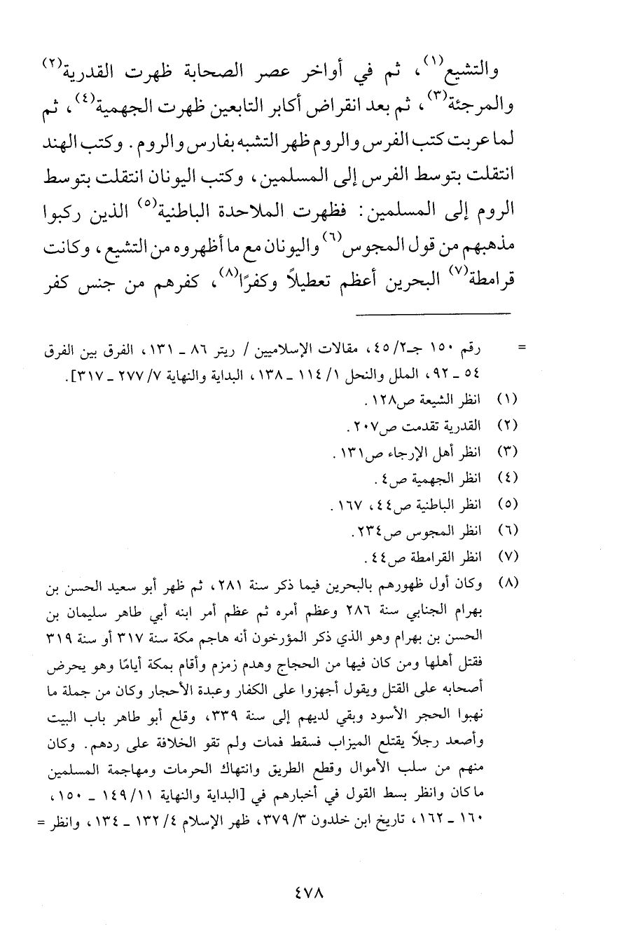 والتشيع ثم في أواخر عصر الصحابة ظهرت القدرية والمرجئة ثم بعد انقراض أكابر التابعين ظهرت الجهمية ثم لما عربت كتب الفرس والروم ظهر التشبه بفارس والروم وكتب الهند انتقلت بتوسط الفرس إلى المسلمين وكتب اليونان انتقلت بتوسط الروم إلى المسلمين فظهرت الملاحدة الباطنية الذين ركبوا مذهبهم من قول المجوس واليونان مع ما أظهروه من التشيع وكانت قرامطة البحرين أعظم تعطيلاً وكفرًا كفرهم من جنس كفر