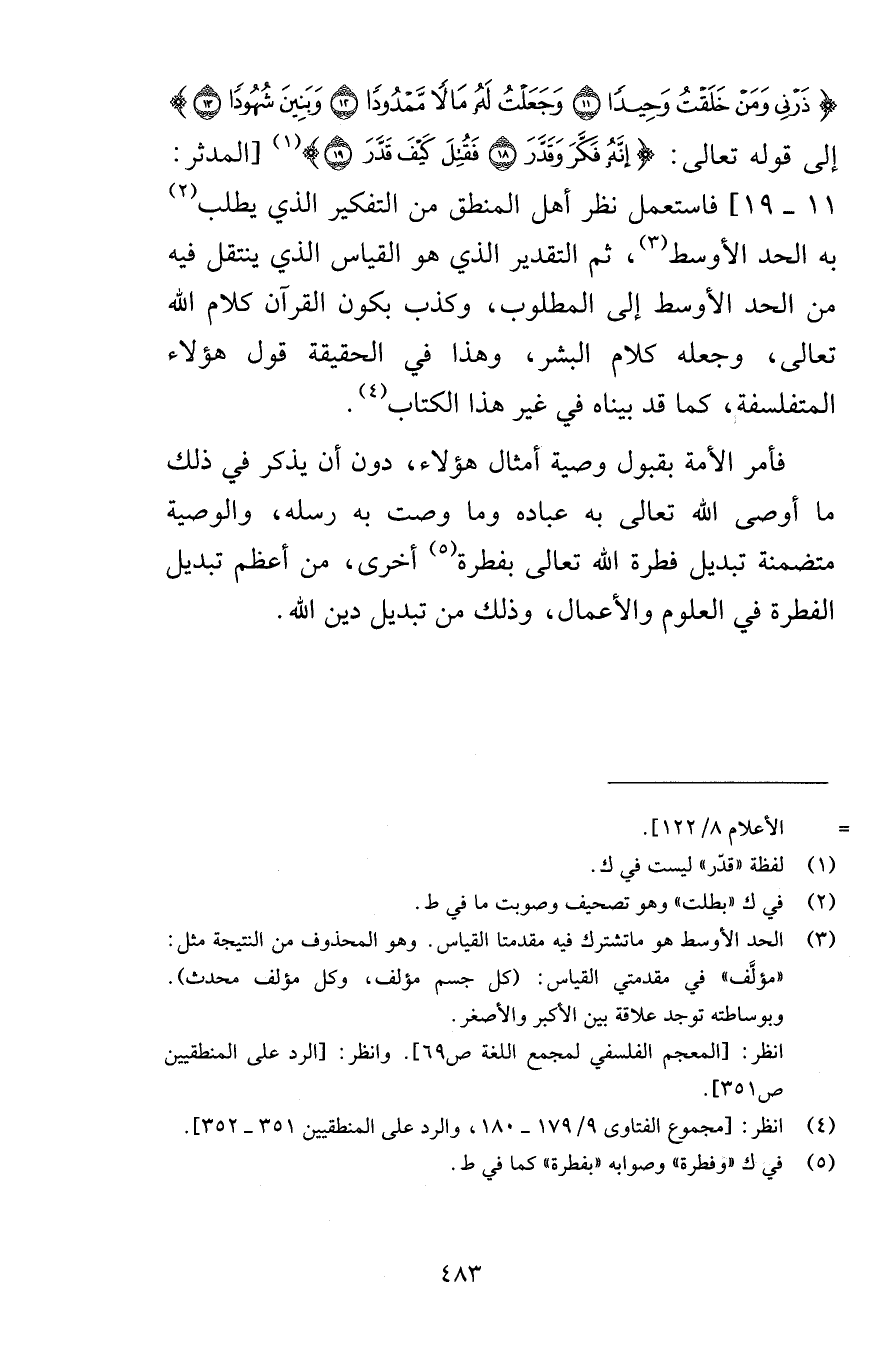 ذَرْنِي وَمَنْ خَلَقْتُ وَحِيداً {11} وَجَعَلْتُ لَهُ مَالاً مَّمْدُوداً {12} وَبَنِينَ شُهُوداً {13} إلى قوله تعالى إِنَّهُ فَكَّرَ وَقَدَّرَ {18} فَقُتِلَ كَيْفَ قَدَّرَ {19} [المدثر 11 - 19] فاستعمل نظر أهل المنطق من التفكير الذي يطلب به الحد الأوسط ثم التقدير الذي هو القياس الذي ينتقل فيه من الحد الأوسط إلى المطلوب وكذب بكون القرآن كلام الله تعالى وجعله كلام البشر وهذا في الحقيقة قول هؤلاء المتفلسفة كما قد بيناه في غير هذا الكتاب فأمر الأمة بقبول وصية أمثال هؤلاء دون أن يذكر في ذلك ما أوصى الله تعالى به عباده وما وصت به رسله والوصية متضمنة تبديل فطرة الله تعالى بفطرة أخرى من أعظم تبديل الفطرة في العلوم والأعمال وذلك من تبديل دين الله