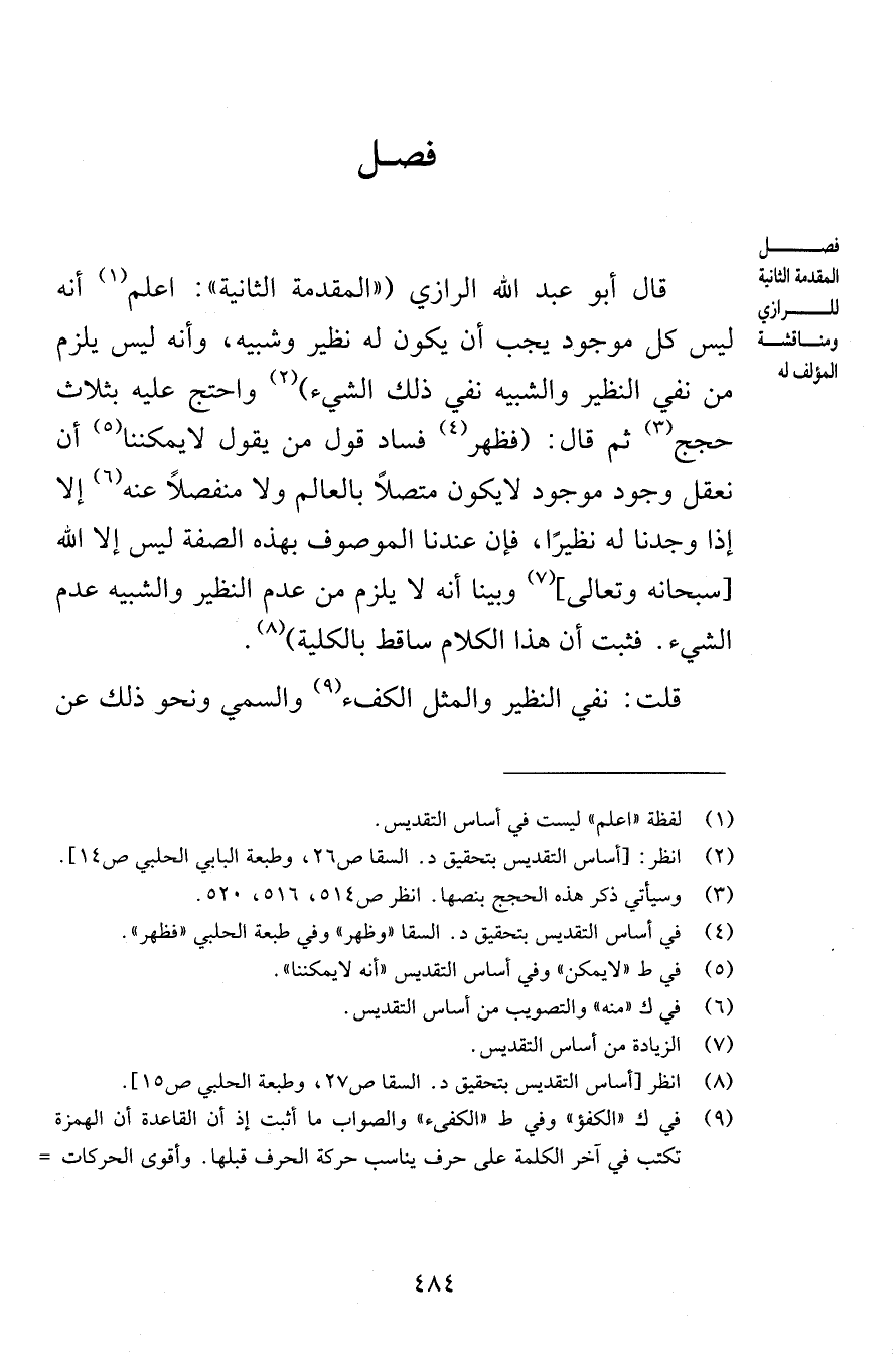 فصل قال أبو عبد الله الرازي المقدمة الثانية اعلم أنه ليس كل موجود يجب أن يكون له نظير وشبيه وأنه ليس يلزم من نفي النظير والشبيه نفي ذلك الشيء واحتج عليه بثلاث حجج ثم قال فظهر فساد قول من يقول لايمكننا أن نعقل وجود موجود لايكون متصلاً بالعالم ولا منفصلاً عنه إلا إذا وجدنا له نظيرًا فإن عندنا الموصوف بهذه الصفة ليس إلا الله سبحانه وتعالى وبينا أنه لا يلزم من عدم النظير والشبيه عدم الشيء فثبت أن هذا الكلام ساقط بالكلية قلت نفي النظير والمثل الكفء والسمي ونحو ذلك عن