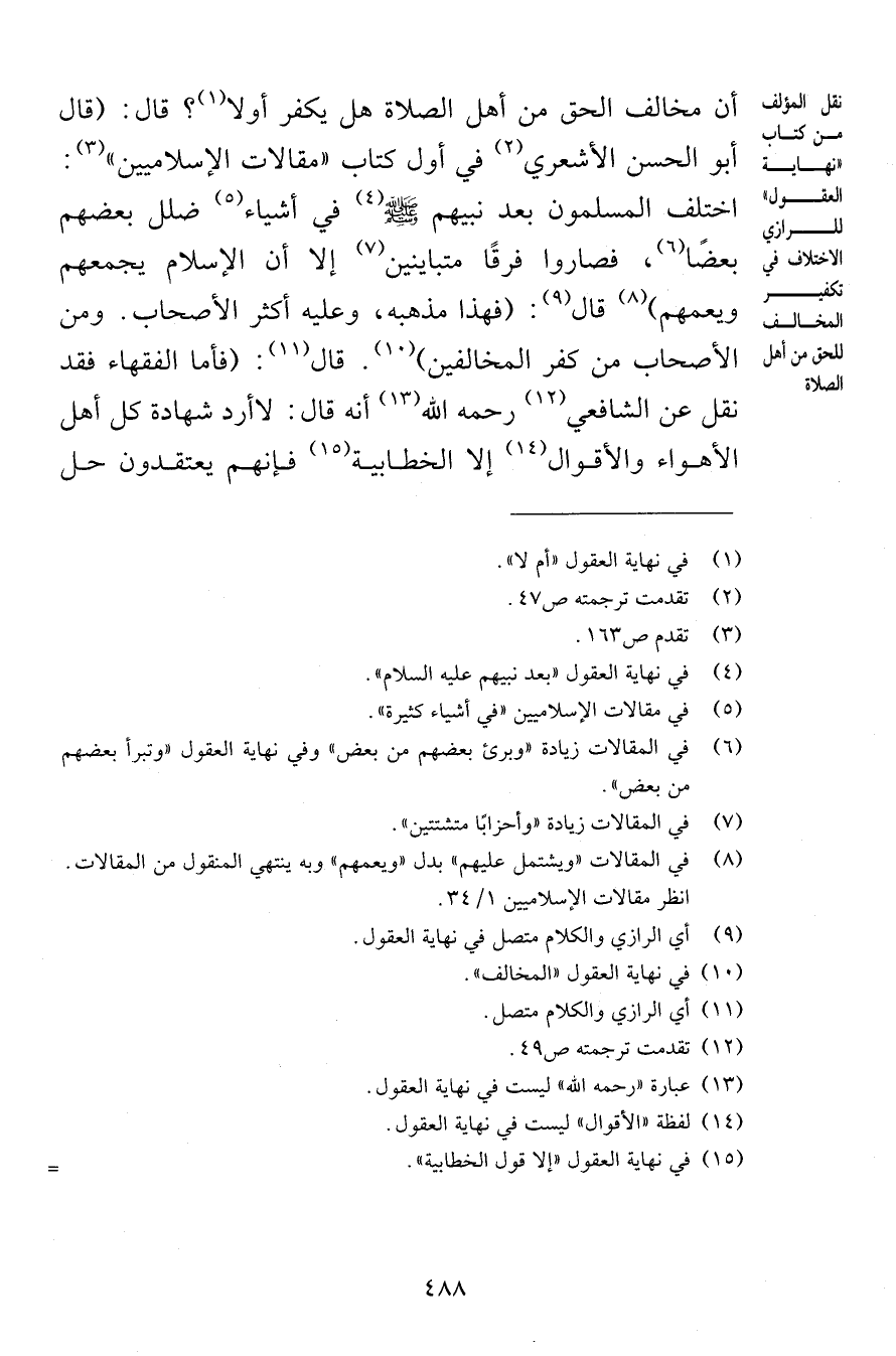 أن مخالف الحق من أهل الصلاة يكفر أولا قال قال أبو الحسن الأشعري في أول كتاب مقالات الإسلاميين اختلف المسلمون بعد نبيهم صلى الله عليه وسلم في أشياء ضلل بعضهم بعضًا فصاروا فرقًا متباينين إلا أن الإسلام يجمعهم ويعمهم قال فهذا مذهبه وعليه أكثر الأصحاب ومن الأصحاب من كفر المخالفين قال فأما الفقهاء فقد نقل عن الشافعي رحمه الله أنه قال لاأرد شهادة كل أهل الأهواء والأقوال إلا الخطابية فإنهم يعتقدون حل
