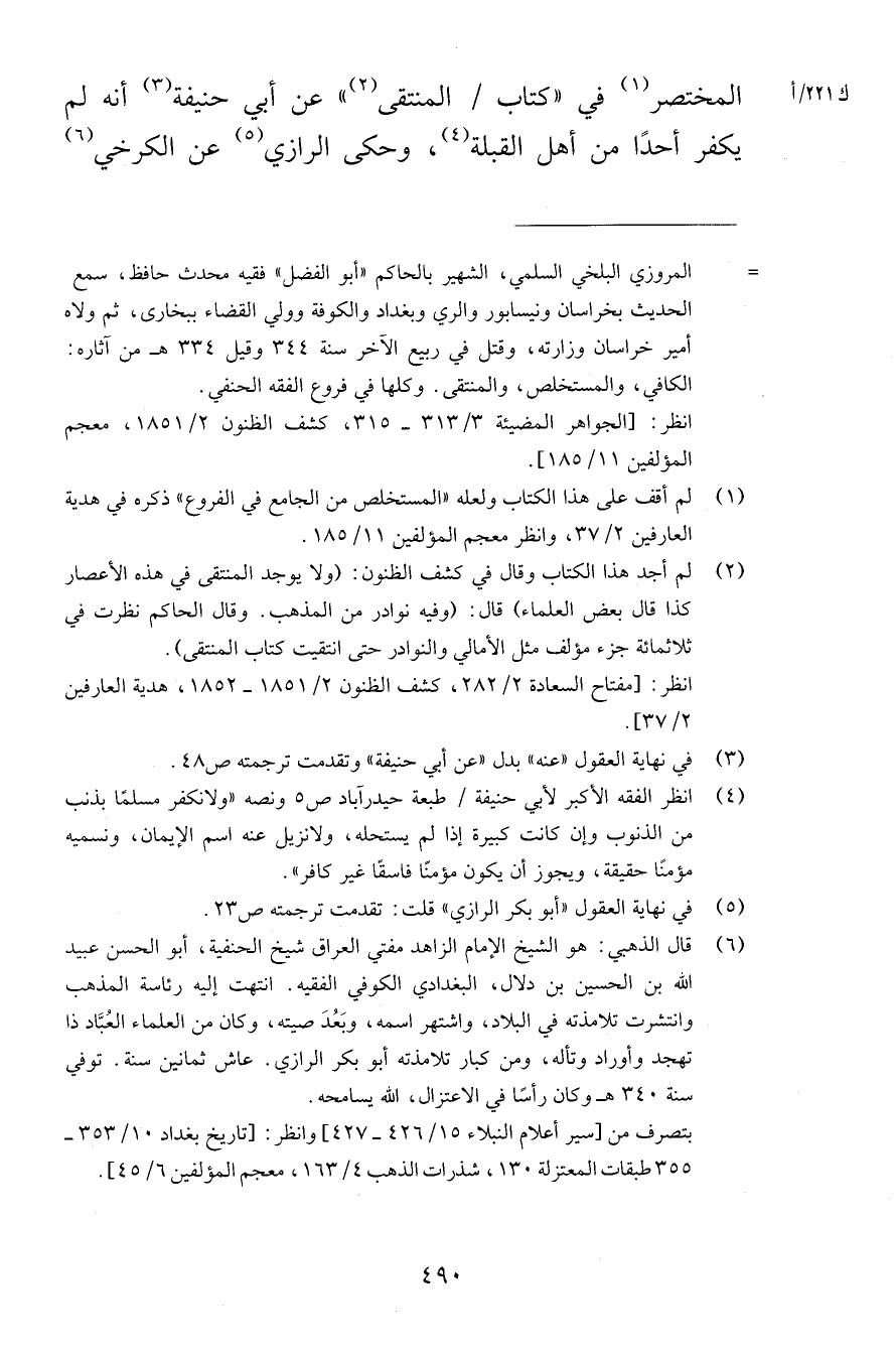 المختصر في كتاب المنتقى عن أبي حنيفة أنه لم يكفر أحدًا من أهل القبلة وحكى الرازي عن الكرخي