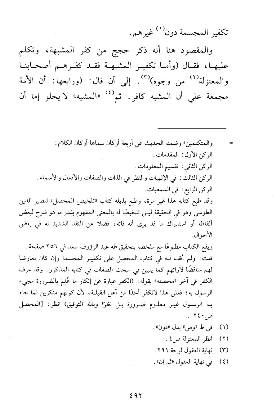 تكفير المجسمة دون غيرهم والمقصود هنا أنه ذكر حجج من كفر المشبهة وتكلم عليها فقال وأما تكفير المشبهة فقد كفرهم أصحابنا والمعتزلة من وجوه إلى أن قال ورابعها أن الأمة مجمعة على أن المشبه كافر ثم المشبه لا يخلو إما أن