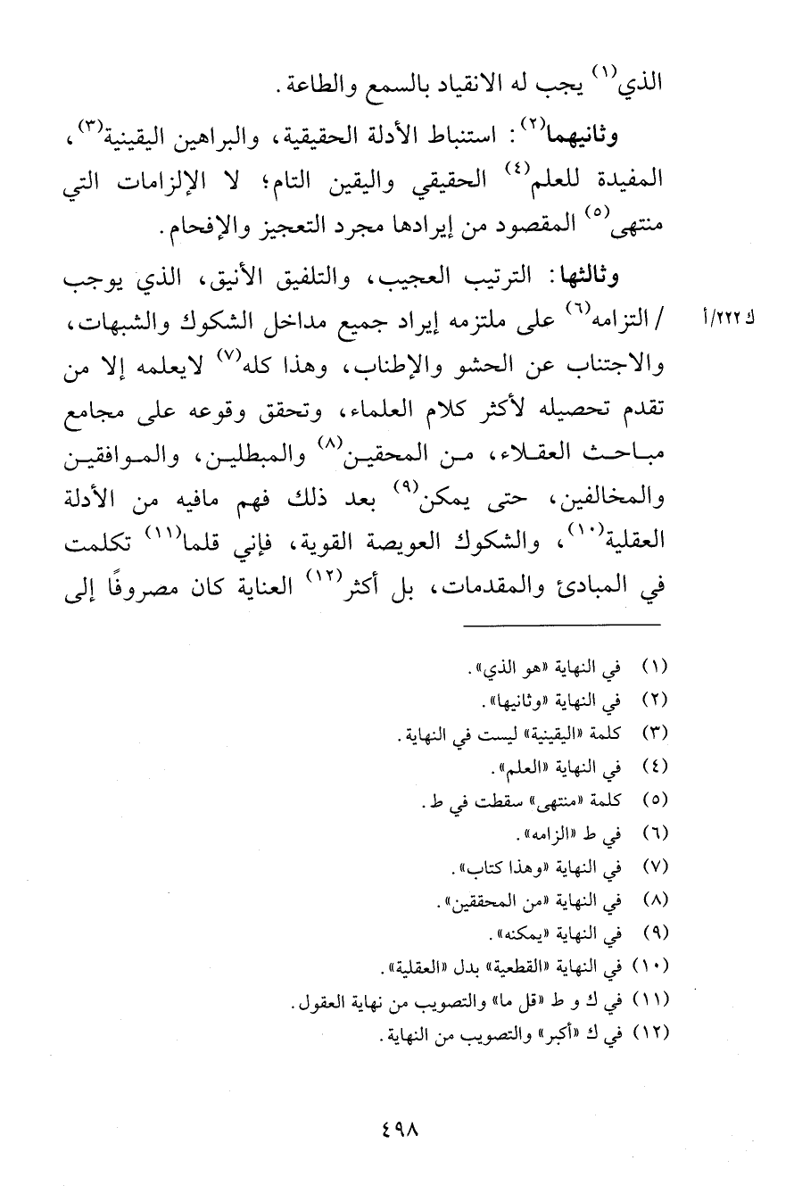الذي يجب له الانقياد بالسمع والطاعة وثانيهما استنباط الأدلة الحقيقية والبراهين اليقينية المفيدة للعلم الحقيقي واليقين التام لا الإلزامات التي منتهى المقصود من إيرادها مجرد التعجيز والإفحام وثالثها الترتيب العجيب والتلفيق الأنيق الذي يوجب التزامه على ملتزمه إيراد جميع مداخل الشكوك والشبهات والاجتناب عن الحشو والإطناب وهذا كله لايعلمه إلا من تقدم تحصيله لأكثر كلام العلماء وتحقق وقوعه على مجامع مباحث العقلاء من المحققين والمبطلين والموافقين والمخالفين حتى يمكن بعد ذلك فهم مافيه من الأدلة العقلية والشكوك العويصة القوية فإني قلما تكلمت في المبادئ والمقدمات بل أكثر العناية كان مصروفًا إلى