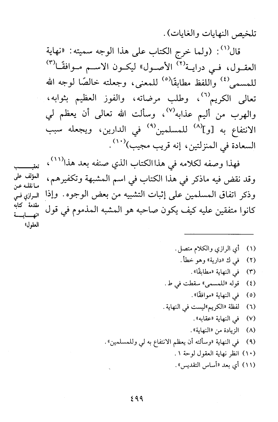 تلخيص النهايات والغايات قال ولما خرج الكتاب على هذا الوجه سميته نهاية العقول في دراية الأصول ليكون الاسم موافقًا للمسمى واللفظ مطابقًا للمعنى وجعلته خالصًا لوجه الله تعالى الكريم وطلب مرضاته والفوز العظيم بثوابه والهرب من اليم عذابه وسألت الله تعالى أن يعظم لي الانتفاع به وللمسلمين في الدارين ويجعله سبب السعادة في المنزلتين إنه قريب مجيب فهذا وصفه لكلامه في هذا الكتاب الذي صنفه بعد هذا وقد نقض فيه ماذكر في هذا الكتاب في اسم المشبهة وتكفيرهم وذكر اتفاق المسلمين على إثبات التشبيه من بعض الوجوه وإذا كانوا متفقين عليه كيف يكون صاحبه هو المشبه المذموم في قول