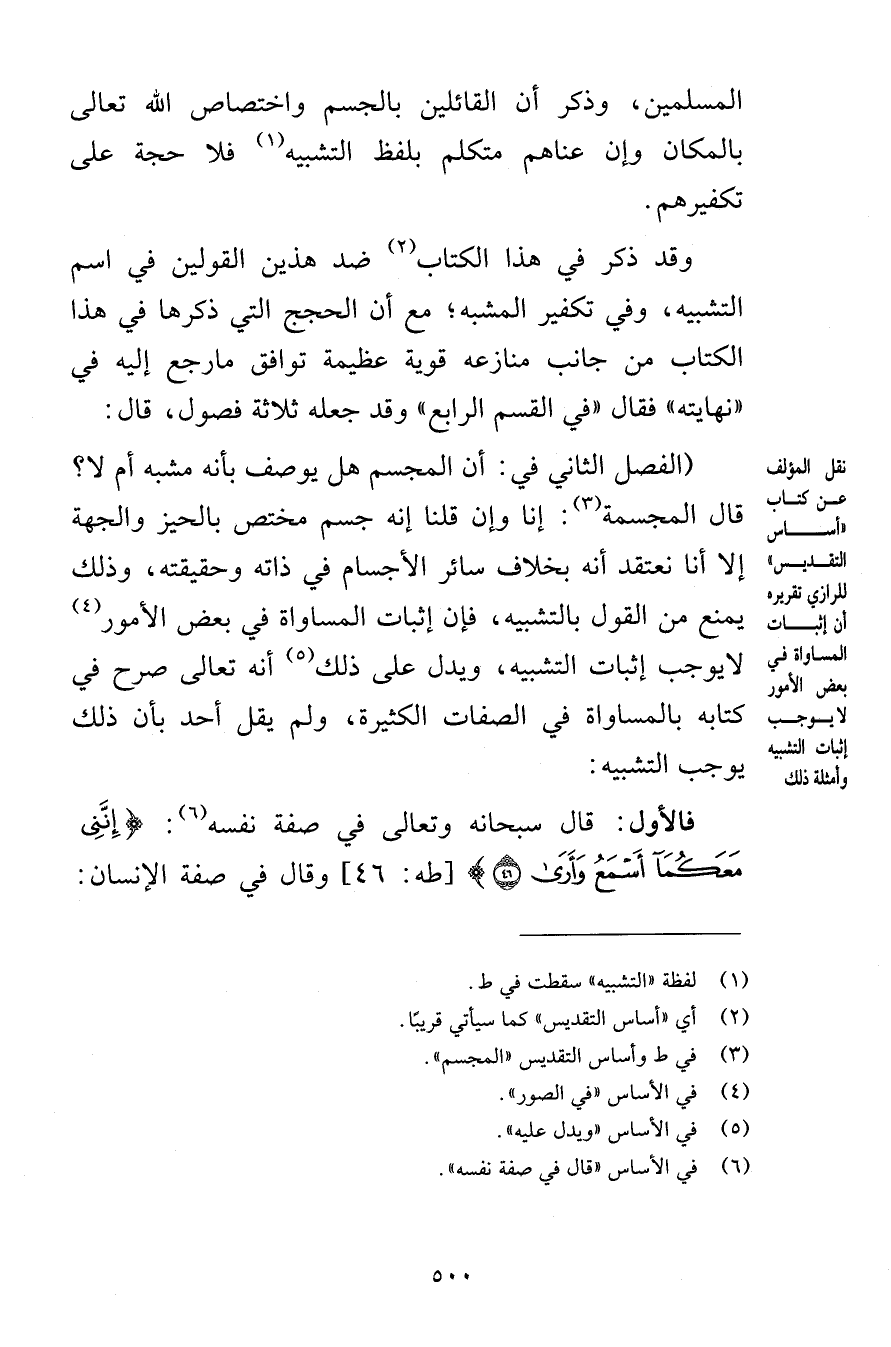 المسلمين وذكر أن القائلين بالجسم واختصاص الله تعالى بالمكان وإن غناهم متكلم بلفظ التشبيه فلا حجة على تكفيرهم وقد ذكر في هذا الكتاب ضد هذين القولين في اسم التشبيه وفي تكفير المشبه مع أن الحجج التي ذكرها في هذا الكتاب من جانب منازعه قوية عظيمة توافق مارجع إليه في نهايته فقال في القسم الرابع وقد جعله ثلاثة فصول قال الفصل الثاني في أن المجسم هل يوصف بأنه مشبه أم لا قال المجسمة إنا وإن قلنا إنه جسم مختص بالحيز والجهة غلا أنا نعتقد أنه بخلاف سائر الأجسام في ذاته وحقيقته وذلك يمنع من القول بالتشبيه فإن إثبات المساواة في بعض الأمور لايوجب إثبات التشبيه ويدل على ذلك أنه تعالى صرح في كتابه بالمساواة في الصفات الكثيرة ولم يقل أحد بأن ذلك يوجب التشبيه فالأول قال سبحانه وتعالى في صفة نفسه إِنَّنِي مَعَكُمَا أَسْمَعُ وَأَرَى {46} [طه 46] وقال في صفة الإنسان