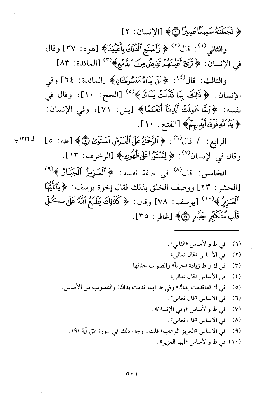 فَجَعَلْنَاهُ سَمِيعاً بَصِيراً {2} [الإنسان 2] والثاني قال وَاصْنَعِ الْفُلْكَ بِأَعْيُنِنَا [هود 37] وقال في الإنسان تَرَى أَعْيُنَهُمْ تَفِيضُ مِنَ الدَّمْعِ [المائدة 83] والثالث قال بَلْ يَدَاهُ مَبْسُوطَتَانِ [المائدة 64] وفي الإنسان ذَلِكَ بِمَا قَدَّمَتْ يَدَاكَ [الحج 10] وقال في نفسه مِمَّا عَمِلَتْ أَيْدِينَا أَنْعَاماً [يس 71] وفي الإنسان يَدُ اللَّهِ فَوْقَ أَيْدِيهِمْ [الفتح 10] الرابع قال الرَّحْمَنُ عَلَى الْعَرْشِ اسْتَوَى {5} [طه 5] وقال في الإنسان لِتَسْتَوُوا عَلَى ظُهُورِهِ [الزخرف 13] الخامس قال في صفة نفسه الْعَزِيزُ الْجَبَّارُ [الحشر 23] ووصف الخلق بذلك فقال إخوة يوسف يَا أَيُّهَا الْعَزِيزُ [يوسف 78] وقال كَذَلِكَ يَطْبَعُ اللَّهُ عَلَى كُلِّ قَلْبِ مُتَكَبِّرٍ جَبَّارٍ {35} [غافر 35]