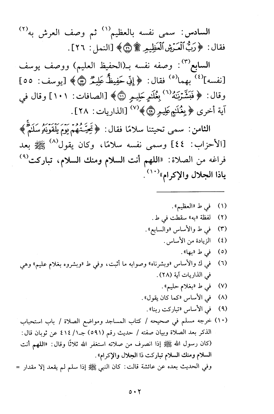 السادس سمى نفسه بالعظيم ثم وصف العرش به فقال رَبُّ الْعَرْشِ الْعَظِيمِ {26} [النمل 26] السابع وصف نفسه بـ الحفيظ العليم ووصف يوسف نفسه بهما فقال إِنِّي حَفِيظٌ عَلِيمٌ {55} [يوسف 55] وقال فَبَشَّرْنَاهُ بِغُلَامٍ حَلِيمٍ {101} [الصافات 101] وقال في آية أخرى بِغُلَامٍ عَلِيمٍ {28} [الذاريات 28] الثامن سمى تحيتنا سلامًا فقال تَحِيَّتُهُمْ يَوْمَ يَلْقَوْنَهُ سَلَامٌ [الأحزاب 44] وسمى نفسه سلامًا وكان يقول صلى الله عليه وسلم بعد فراغه من الصلاة اللهم أنت السلام ومنك السلام تباركت ياذا الجلال والإكرام