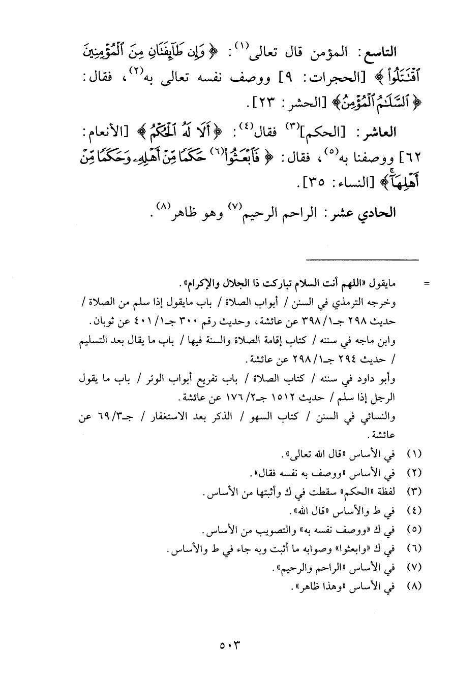 التاسع المؤمن قال تعالى وَإِن طَائِفَتَانِ مِنَ الْمُؤْمِنِينَ اقْتَتَلُوا [الحجرات 9] ووصف نفسه تعالى به فقال السَّلَامُ الْمُؤْمِنُ [الحشر 23] العاشر الحكم فقال أَلاَ لَهُ الْحُكْمُ [الأنعام 62] ووصفنا به فقال فَابْعَثُواْ حَكَماً مِّنْ أَهْلِهِ وَحَكَماً مِّنْ أَهْلِهَا [النساء 35] الحادي عشر الراحم الرحيم وهو ظاهر